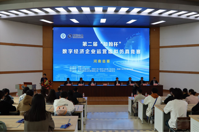 4月15日上午,河南省赛区“知翰杯”数字经济企业运营虚拟仿真竞赛开幕式于河南大学金明校区计算机与信息工程学院报告厅举行。河南大学党委副书记冯淑霞,国家级实验教学示范中心联席会经管学科组副组长、哈尔滨商业大学张莉,河南大学商学院党委书记左辞波,计算机与信息工程学院党委书记周志民,欧亚国际学院党委书记王振存,就业创业指导中心副主任马跃敏,商学院副院长席龙胜,计算机与信息工程学院副院长阎朝坤,欧亚国际学院副院长苏芳芳,重庆知翰合众科技有限公司营销总监马朝阳,及参赛学校各代表团教师代表、学生代表参加开幕式。开幕式由河南大学教务处副处长朱显峰主持。