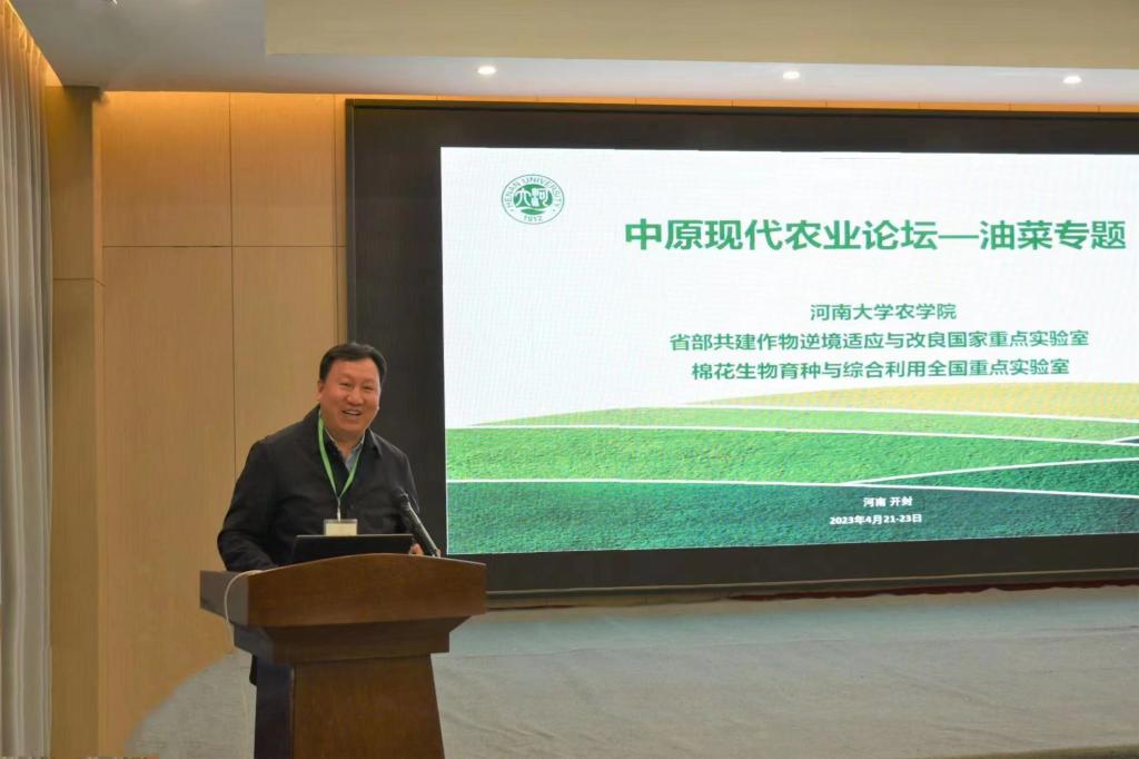 4月22—23日,由河南大学农学院、省部共建作物逆境适应与改良国家重点实验室、棉花生物育种与综合利用全国重点实验室联合主办的“中原现代农业论坛——油菜专题报告会”在河南开封如期举行。来自中国农业科学院油料作物研究所、中国科学院遗传与发育生物学研究所、加拿大曼尼托巴大学(University of Manitoba)、华中农业大学、西南大学、华中科技大学、扬州大学、西北农林科技大学、江苏大学、湖南农业大学、陕西省杂交油菜研究中心、江苏省农业科学院、湖南省作物科学研究所、河南省农业科学院等单位的30余位专家应邀参会。河南大学副校长苗雨晨出席会议并致辞。棉花生物育种与综合利用全国重点实验室副主任赵翔,农学院部分班子成员及教师和学生代表参加了会议。会议由农学院执行院长王道杰主持。线上线下共计300余人参会。