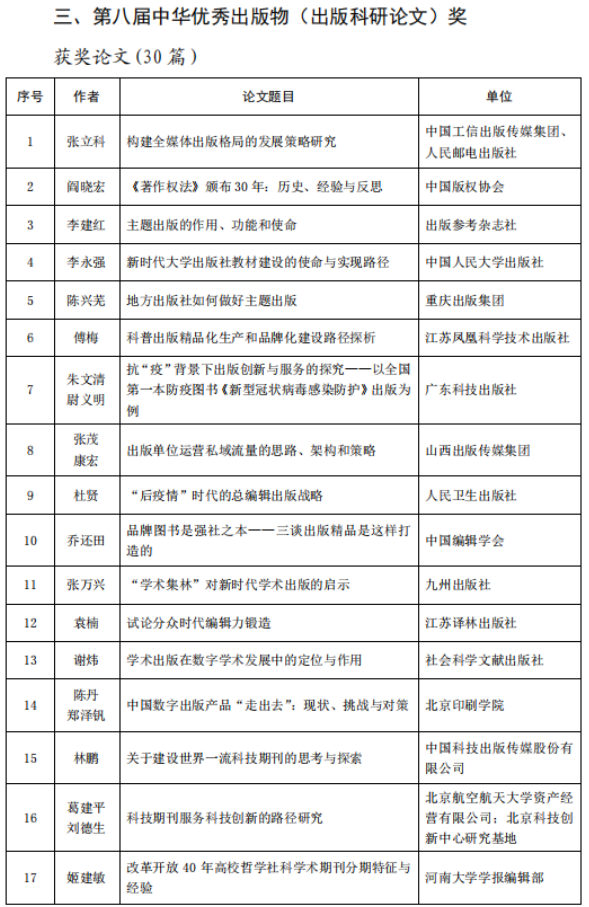 中华优秀出版物奖与“五个一工程”奖、中国出版政府奖并称中国出版界“三大奖”,三年评选一次。本届共评出图书奖100种,音像电子出版物奖30种,出版科研论文奖30篇。据悉,姬建敏是全国高校期刊界唯一获奖者。