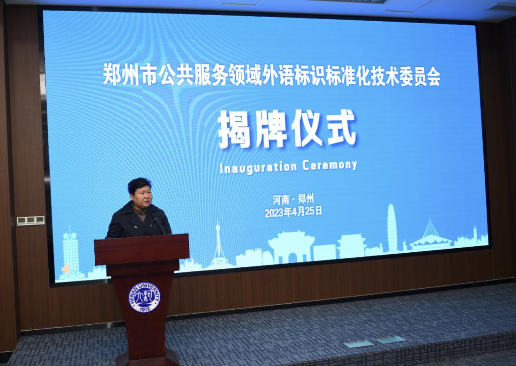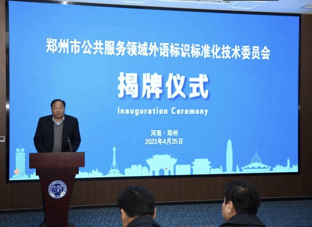 上午9:30,郑州市公共服务领域外语标识标准化技术委员会揭牌仪式在友兰学堂南楼B座105报告厅举行。河南大学党委常委、副校长孙君健致词。他表示,服务地方经济社会发展是高校义不容辞的社会责任,也是学校加快“双一流”创建、实现高质量发展的内在要求。此次签约揭牌将充分发挥双方在外语人才和社会资源的集聚优势,进一步推动探索构建校地合作新模式、创新外语与翻译人才培养新途径,努力打造高校融入区域经济发展的特色品牌。希望郑州市公共服务领域外语标识标准化技术委员会的成立,能更好地推进郑州市公共服务领域的发展,为建设幸福文明、现代化国际化的大都市贡献积极力量。郑州市人民政府外事办公室主任潘新红致辞,她衷心期望标委会站位高远,以人民的需求、城市的需求为己任,坚持新发展理念,深入广泛调研,将外语标识技术标准与我市城市语言景观实际、国内外行业发展相结合,服务经济社会发展、服务郑州高水平对外开放。