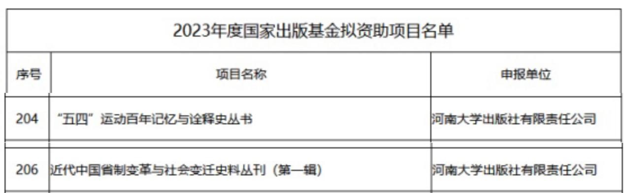 近日,2023年度国家出版基金拟资助项目评审结果公布。河南大学历史文化学院张宝明教授的《“五四”运动百年记忆与诠释史丛书》、翁有为教授的《近代中国省制变革与社会变迁史料丛刊(第一辑)》顺利入选。