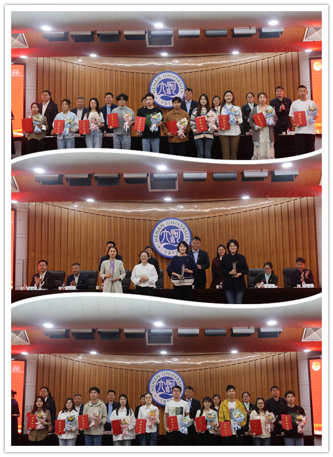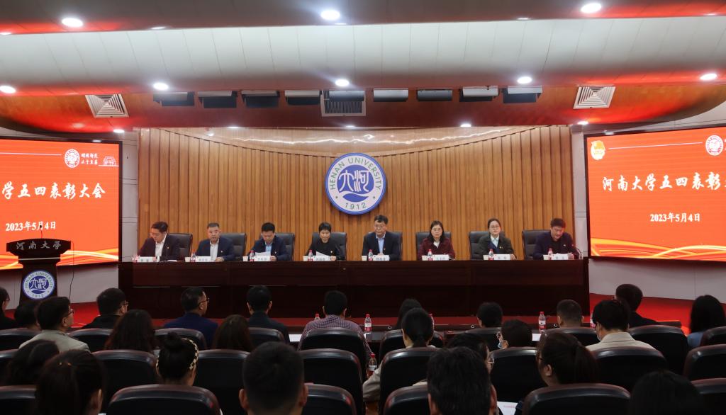 龚森宣读表彰文件。本次大会为全国“五四红旗团支部”荣誉称号获得单位、河南大学第一附属医院门诊医技团支部及获得河南省“两红两优”的文学院团委、计算机与信息工程学院团委、地理与环境学院2020级环境科学班团支部、哲学与公共管理学院社会工作专业2020级团支部单位颁奖,对化学与分子科学学院刘雪等10名“河南大学青年五四奖章”获得者、化学与分子科学学院团委等10个“河南大学五四红旗团委”、文学院2021级(研究生)第一团支部等115个“河南大学五四红旗团支部”、历史文化学院贾明荟等885名“河南大学优秀共青团员”、教育学部李科等371名“河南大学优秀共青团干部”、哲学与公共管理学院李源等215名“河南大学青年志愿者标兵”、经济学院刘奥龙等39名“河南大学青年岗位标兵”给予表彰,并为国际商学院、化学与分子科学学院、生命科学学院、经济学院等获得第十四届“挑战杯”河南大学大学生创业计划竞赛“挑战杯”和“优胜杯”的单位颁奖。龚森表示,受表彰的集体和个人要珍惜荣誉,再接再厉,更好地发挥模范带头作用。同时,他倡议全校各级团组织和广大团员青年以受表彰对象为榜样,立足新起点、担当新使命、展现新作为,为学校建设研究型综合性国际化一流大学积蓄力量,在全面建设社会主义现代化国家的壮丽史诗中奋力续写新的辉煌。出席大会的领导老师为受表彰的集体和个人颁奖。