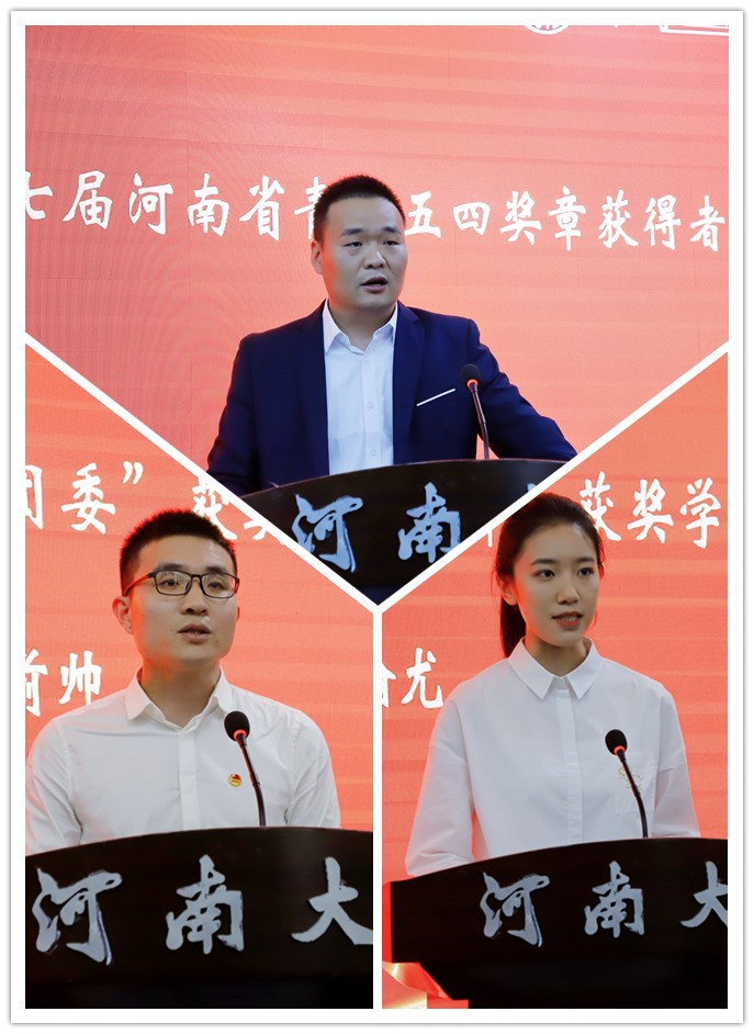 第27届“河南省青年五四奖章”获得者代表蔡国发,河南省“五四红旗团委”获奖单位代表、计算机与信息工程学院团委书记程前帅,以及河南大学“优秀共青团干部”获奖代表、新闻与传播学院本科生张瀚尤依次发言。蔡国发分享自己的求学与工作经历,呼吁广大青年要勇敢肩负起时代赋予的重任,志存高远,脚踏实地,努力为学校打造中原“双航母”、建设“双一流”高校贡献力量。程前帅汇报学院团委一年来的工作情况,表示共青团干部应当锐意创新、积极进取,以强化政治理论学习不断提升做好新形势下青年思想政治教育工作的能力。张瀚尤谈道,在五四精神的指引下,青年要勇做时代大潮中一朵奔腾的“后浪”,在担当中历练、在尽责中成长、在奋斗中绽放。
