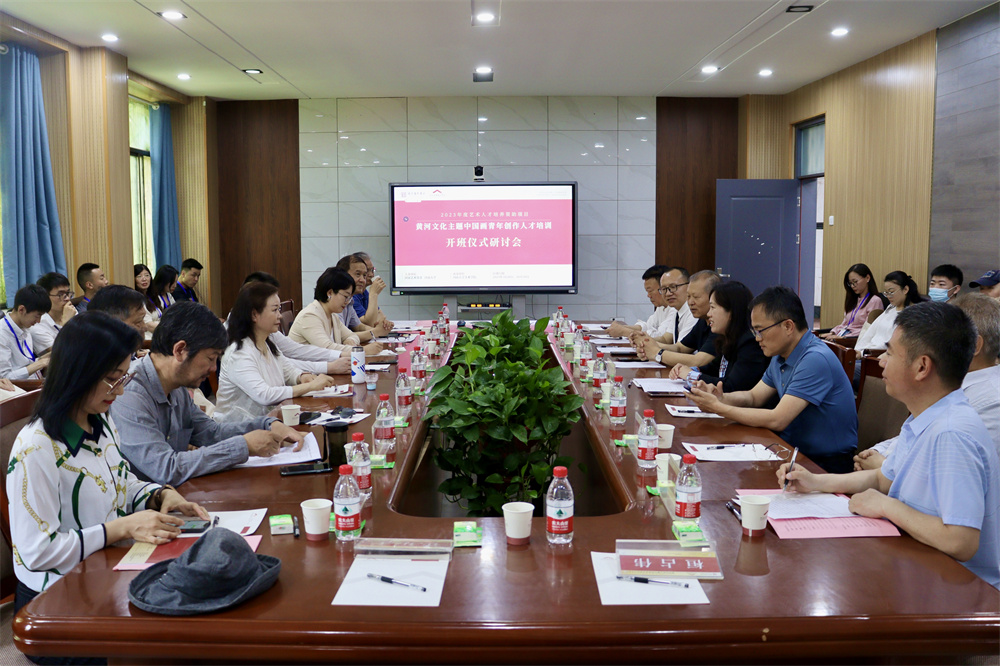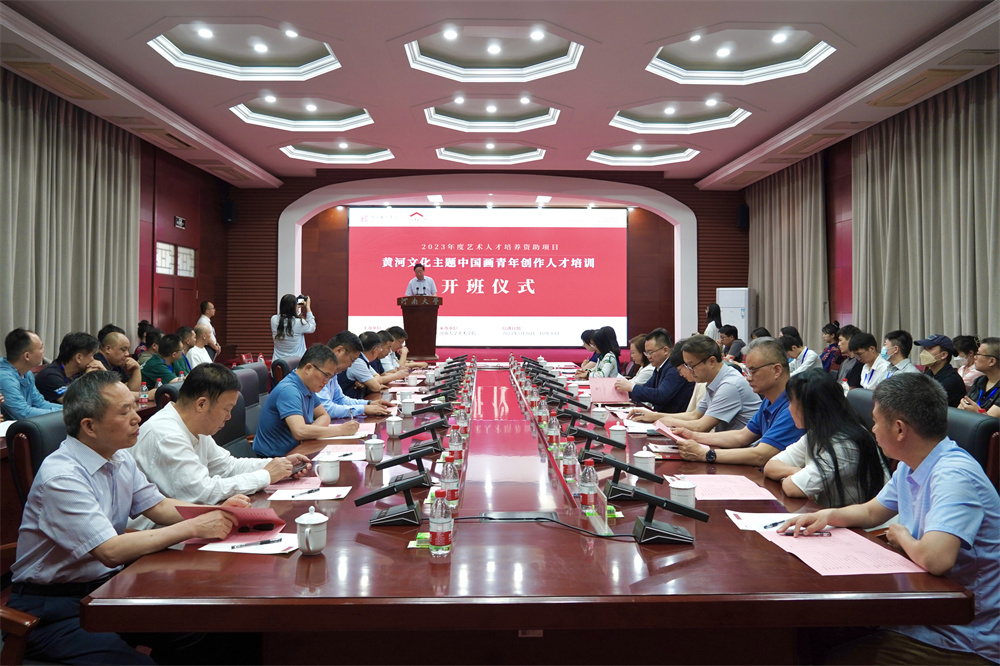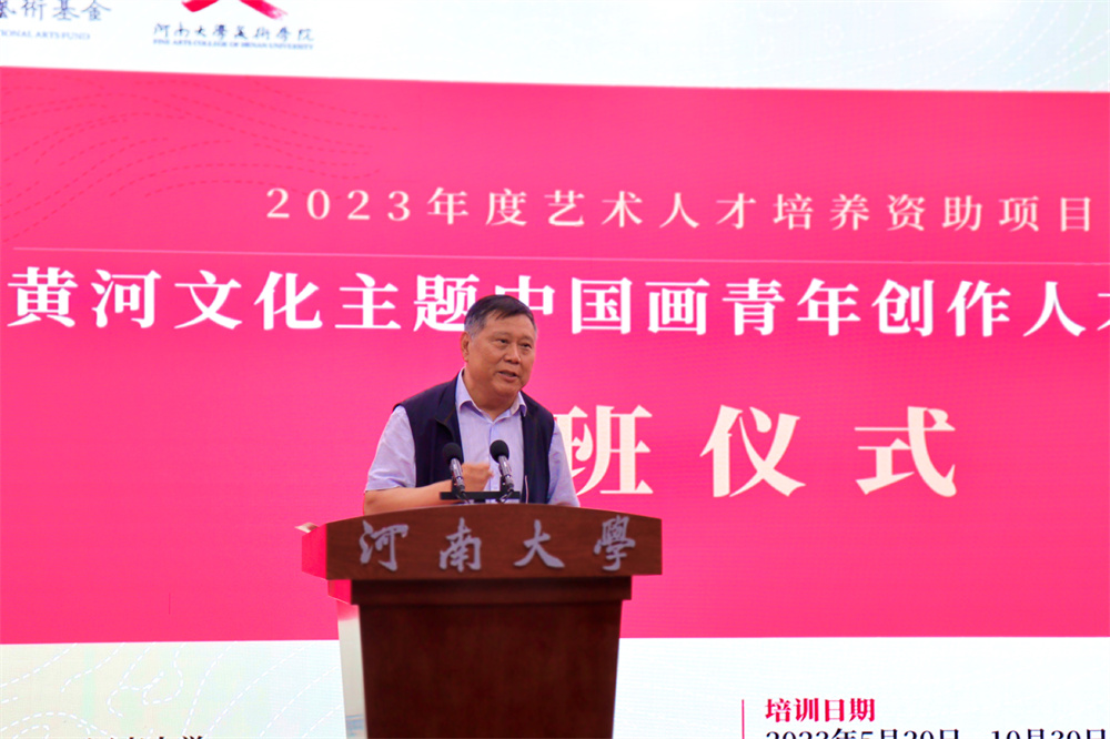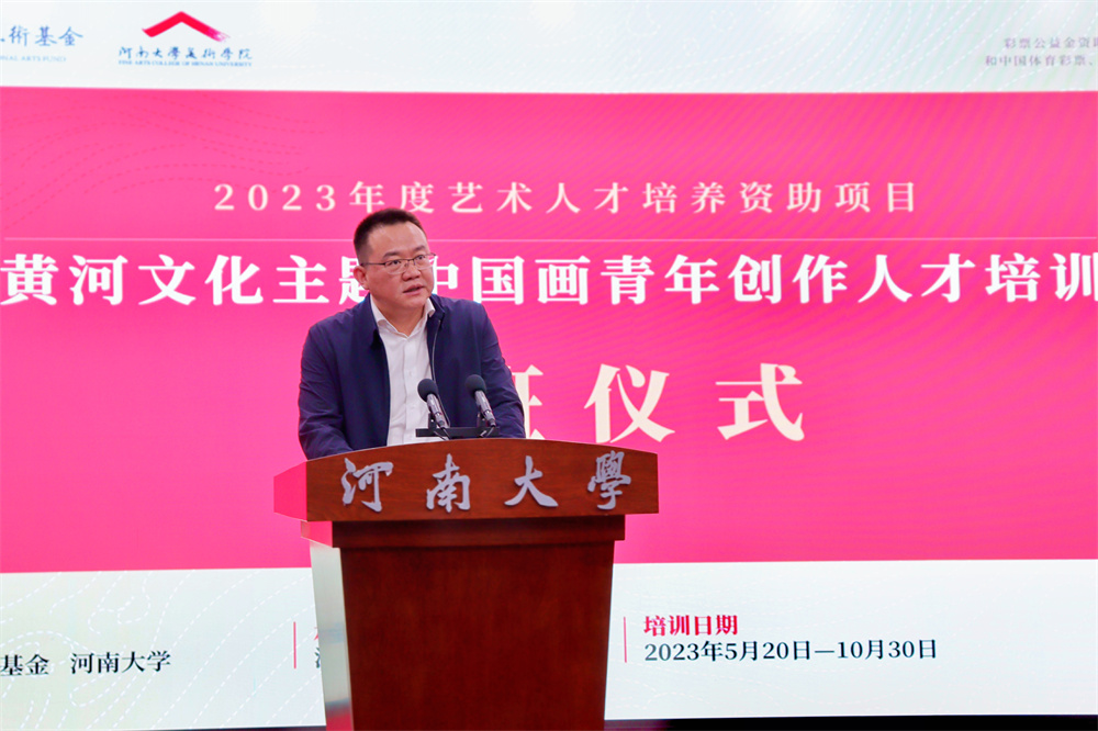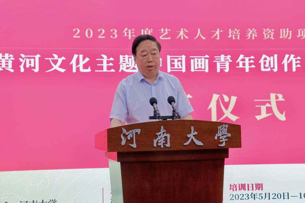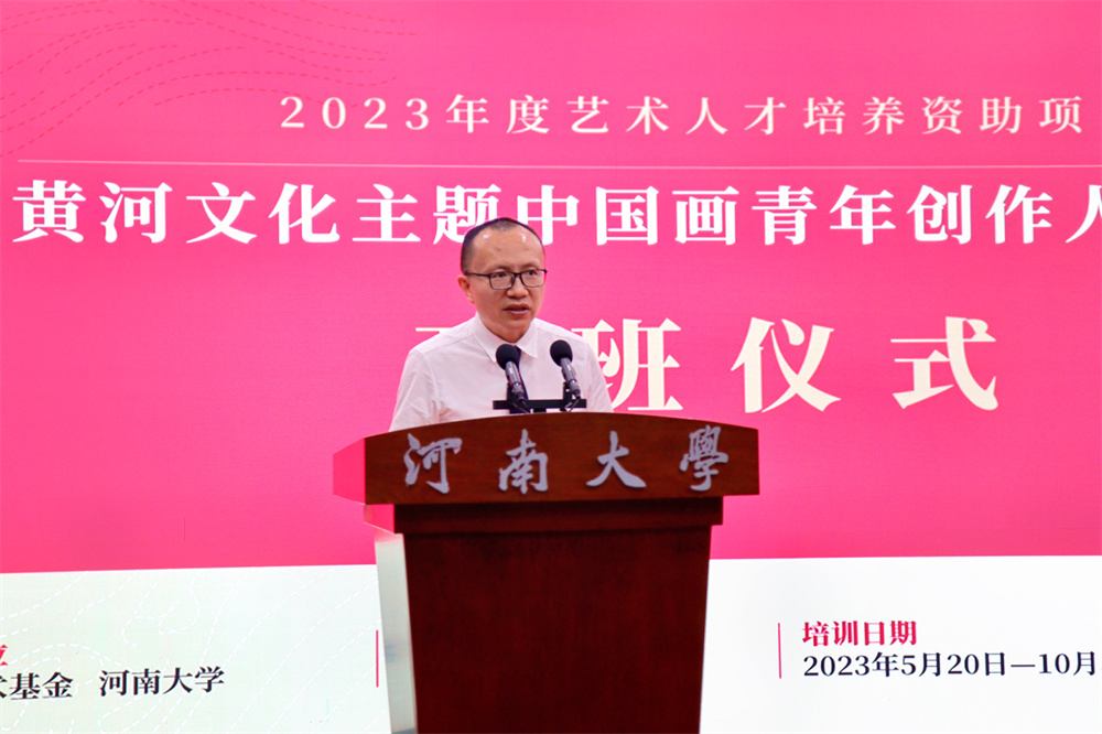 郭涛在致辞中介绍了国家艺术基金的宗旨以及基金成立十年来为国家艺术文化事业繁荣发展所作的贡献,并对近年来河南省以及河南大学所举办的艺术人才培养资助项目情况进行了说明。他表示,黄河文化是中华文明延续流传的重要载体,是世界文明互鉴的推动力量。黄河历来是艺术文化创作的母题,《黄河文化主题中国画青年创作人才培训》项目是河南大学承办的第五个艺术人才培训资助项目,兼具了时代价值与学术价值,新时代需要更多的青年创作者进一步挖掘黄河文化内涵、讲好黄河故事,用中国画这一传统艺术手段,推动中华优秀传统文化创造性转化、创新性发展。他对参训学员提出了三点殷切希望:一要坚持以习近平新时代中国特色社会主义思想为指导,深入学习宣传贯彻党的二十大精神,用心用情用功描绘新时代新征程的恢弘气象。二要坚持守正创新,以跟上时代的精品力作开拓文艺新境界。三要坚持明德修身,把个人的道德修养、社会形象与作品的社会效果统一起来,在追求德艺双馨中成就人生价值。