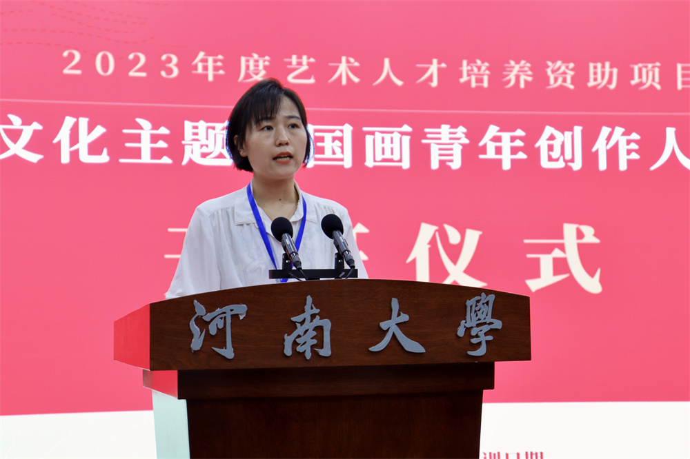 项目学员代表、来自山西省书画院的程园园发言。她向国家艺术基金、河南大学、河南大学美术学院提供的学习机会表示感谢,期待能向各位专家学者求教,与来自全国的中国画青年画家展开交流,深入了解黄河文化精髓,提升自我文化艺术素养和审美能力,力争创作出思想精深、艺术精湛、制作精良的艺术佳作,勇攀艺术高峰。