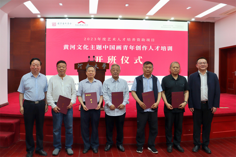 5月20日上午,国家艺术基金2023年度艺术人才培养资助项目《黄河文化主题中国画青年创作人才培训》开班仪式在河南大学明伦校区小礼堂举行。河南大学党委常委、副校长许绍康,国家艺术基金管理中心监督处处长郭涛以及业界相关专家领导、项目组导师代表、项目组负责人等出席仪式。项目组全体学员、河南大学美术学院班子全体成员、部分骨干教师和研究生参会。仪式由河南大学美术学院院长席卫权主持。