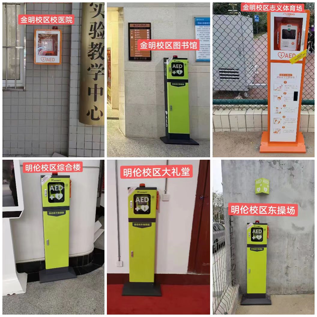 目前,我校通过校医院安装自动体外除颤仪(AED)分别分布于金明校区:校医院西门北侧、图书馆一楼大厅、志义体育场内西南角;明伦校区:综合教学楼一楼大厅、大礼堂门厅内、东操场观礼台旁等场所。
