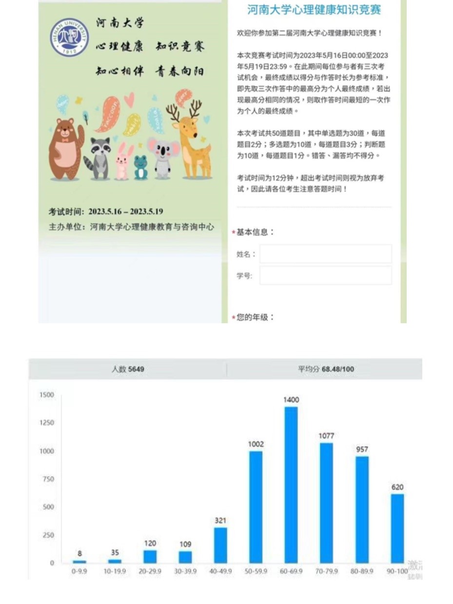 以竞赛形式普及大学生在日常生活中需要的掌握的心理健康知识,学生先通过线上自学,再参加线上答题竞赛,以赛促学,以学促行。据统计,本次竞赛共有近6000人参与线上知识学习和竞赛比拼,充分体现了我校学生积极的学习态度和高涨的竞赛热情,有效提升了学生心理健康认知水平。