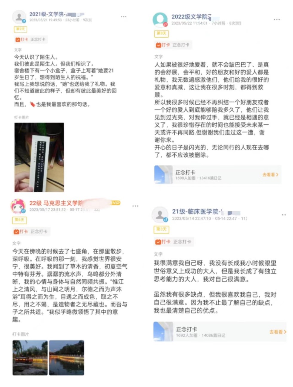 近2000名学生通过连续14天在“小打卡”程序的圈子里以“文字+图片”的形式互相分享自己的美好生活与心路历程,逐渐从繁忙的学习生活中抽离出来,从另一个视角关注自己、关注生活,体验内在的宁静,学会更加弹性地应对各种压力和挑战。