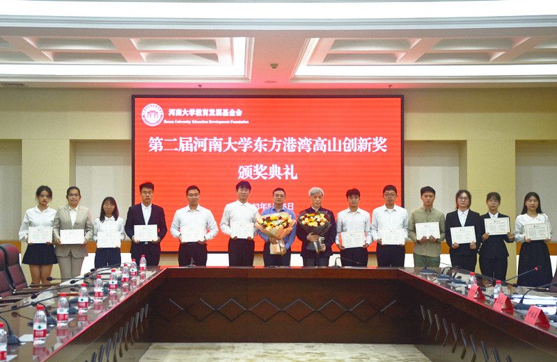 刘波宣读了表彰文件,全校共评选出李森、周超、朱新宝、夏松、梁雅喻、杨奕伦、付雅洁、周沿志、范韦华、赵果、蒋凯欣、白露等12名学生获得2022年度“河南大学东方港湾高山创新奖”。