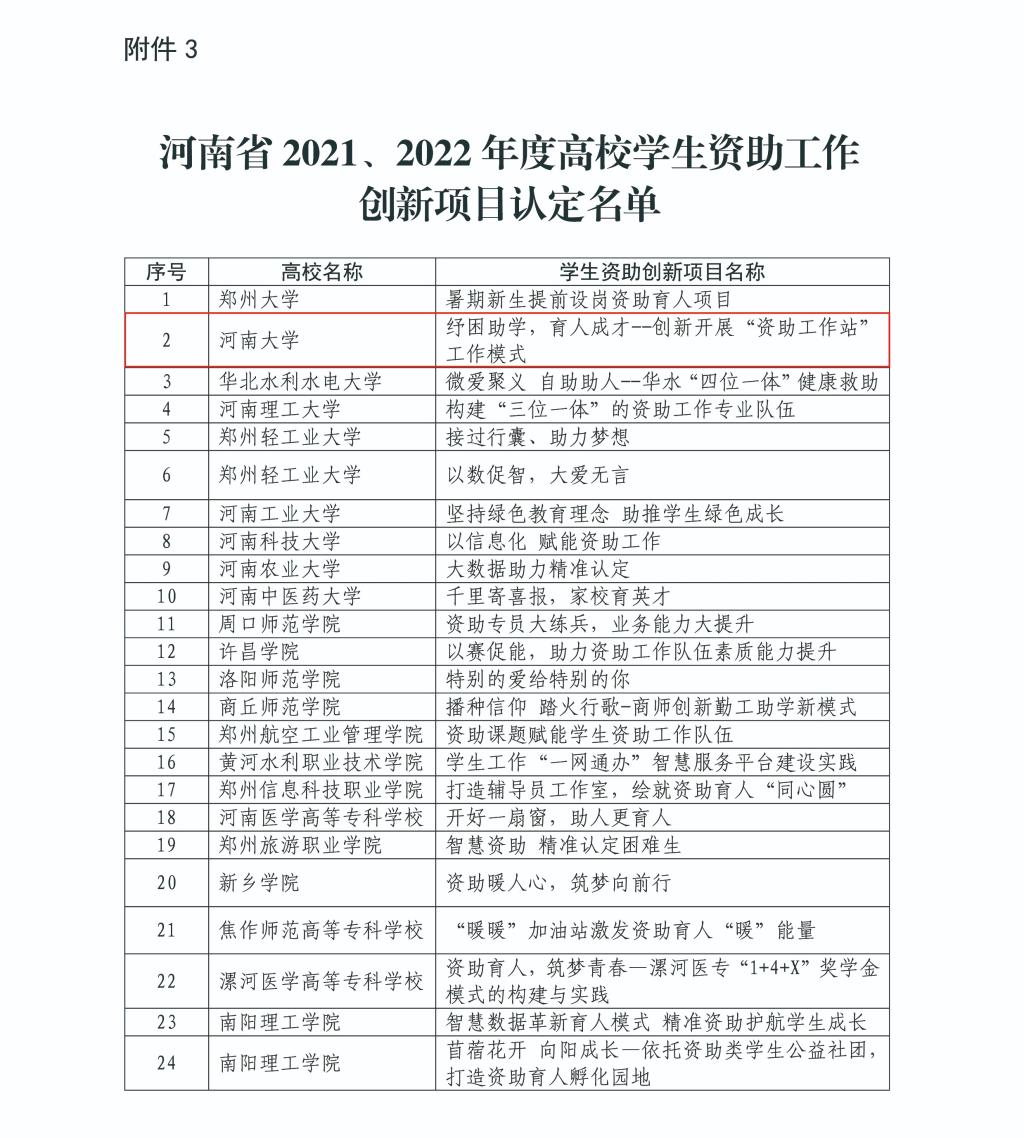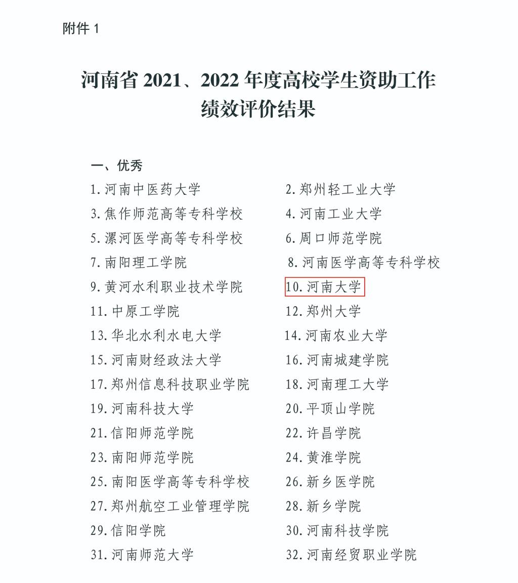 近日,河南省教育厅、国家开发银行河南省分行下发《关于发布全省高校和省属中职学校2021—2022年度学生资助工作绩效评价结果的通知》,我校再度蝉联全省高校2021—2022年度高校学生资助工作绩效评价“优秀”等级,连续四次获得该项荣誉。同时,在河南省首届“学生资助工作创新项目”评选中,我校报送的《纾困助学、育人成才——创新开展“资助工作站”新模式》项目在全省79个项目中脱颖而出,成功获评河南省学生资助工作创新品牌。
