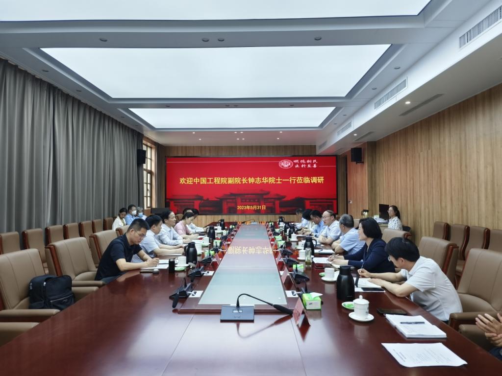 5月31日,中国工程院副院长钟志华院士带队来校调研并召开座谈会。中国工程院一局副局长唐海英、战略咨询中心副主任潘刚、科学道德与院士监督处处长赵千、办公厅秘书乔英俊,河南省科技厅副厅长刘英锋,校长、中国科学院院士张锁江,河南省时空大数据产业研究院院长、中国工程院院士王家耀及其团队、地理与环境学院党委书记乔家君以及有关职能部门负责人参加座谈。科学技术研究院院长胡彬彬主持座谈会。