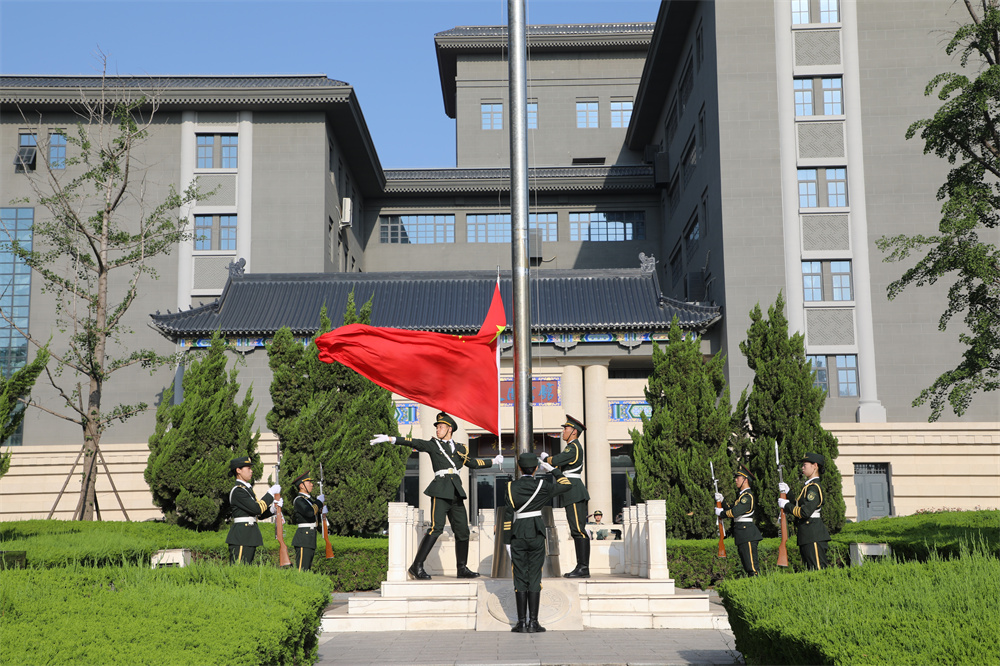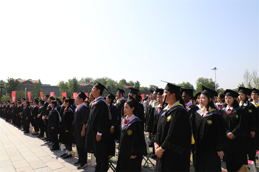 在清晨的暖阳下,庄严的国歌声缓缓响起,全体与会人员面向国旗,迎着初升的朝阳,庄严注目。鲜艳的五星红旗迎风飘扬,向在场的每个人挥手致意。毕业学子们目光炙热,彼此相依,留恋着这最后一次庄重的盛大相聚。