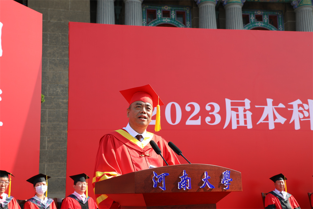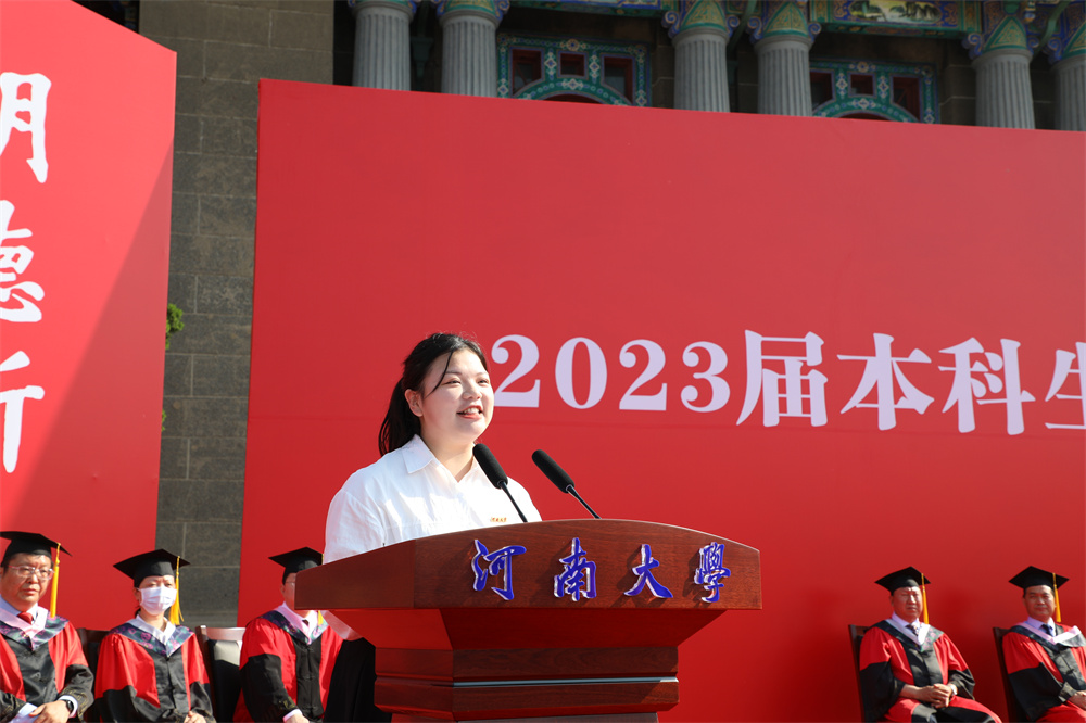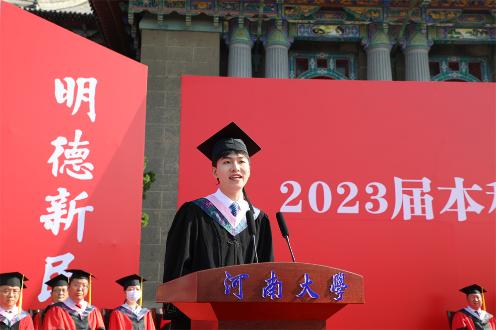 “作为‘铁塔牌’学子,青春的我们将在星辰大海中追寻心中所爱。”本科毕业生代表、哲学与公共管理学院行政管理专业毕业生何俊澈发言,总结了自己在河大四年青春时光中的收获,表达了河大学子作为当代青年接续奋斗的热忱与自强不息的时代精神。他说道:“不管走到哪里,我们一生都会铭记‘铁塔牌’这一河大学子自豪的标签,铭记我们留在河大的青春。我们将带着母校滋养我们的热爱出发,并把这份热爱撒向世界!”真挚的话语中满溢着拳拳的爱校之心与殷殷不舍之情。