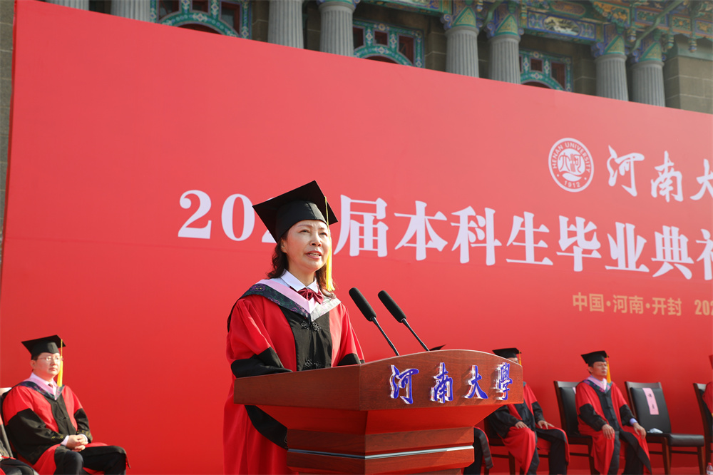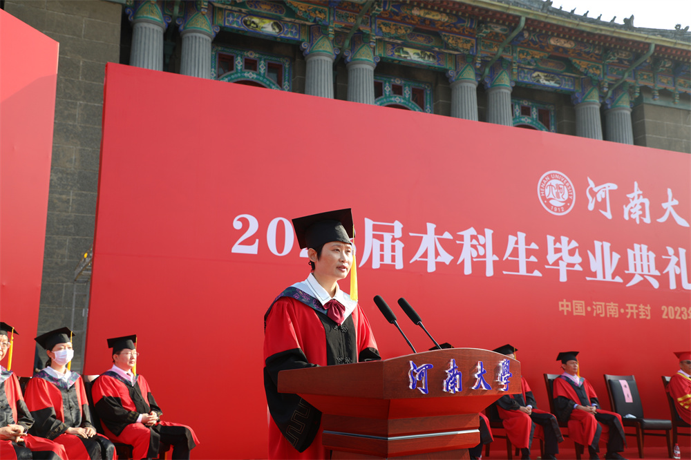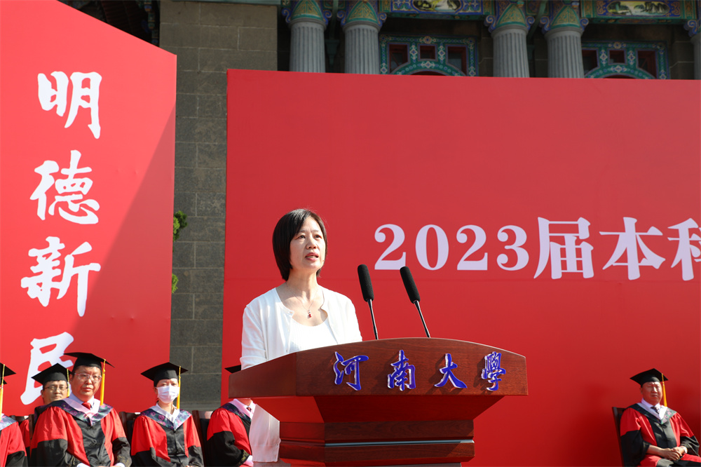 校党委副书记、校学位评定委员会副主席冯淑霞宣读《河南大学关于表彰2023年优秀应届毕业生的决定》和《河南大学关于