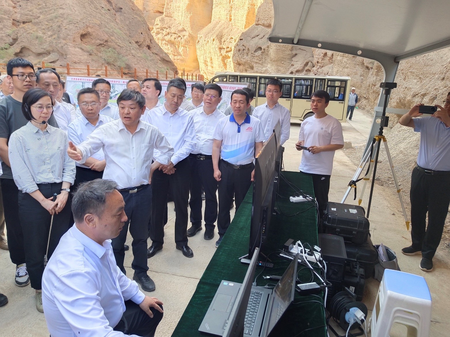 在景泰黄河石林国家地质公园,秦奋演示了黑山峡水利枢纽工程分析模拟系统,汇报了黑山峡水利枢纽工程对公园淹没范围、变化过程和影响程度。黄润秋充分肯定了我校承担的水利枢纽工程对景泰黄河石林国家地质公园影响评价及保护研究成果,并提出了殷切期望。他指出,要充分发挥现代科学技术作用,精心细心准确地研究水利工程的作用和影响,更好地发挥重大水利工程的工程效益、环境效益、经济效益和社会效益,保障黄河长治久安、促进全流域生态保护和高质量发展。