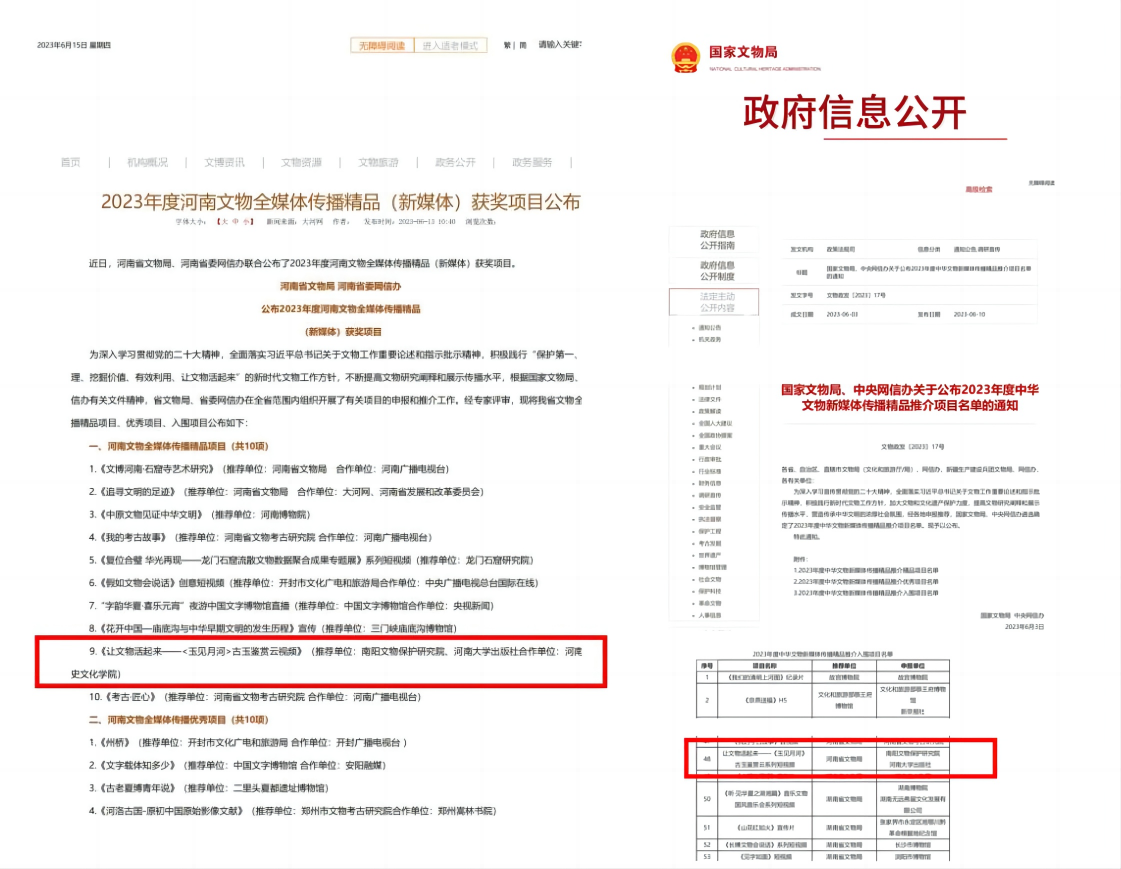 6月13日,河南省文物局、河南省委网信办也联合公布了2023年度河南文物全媒体传播精品获奖项目,全省共计10项,《玉见月河》再度名列其中。