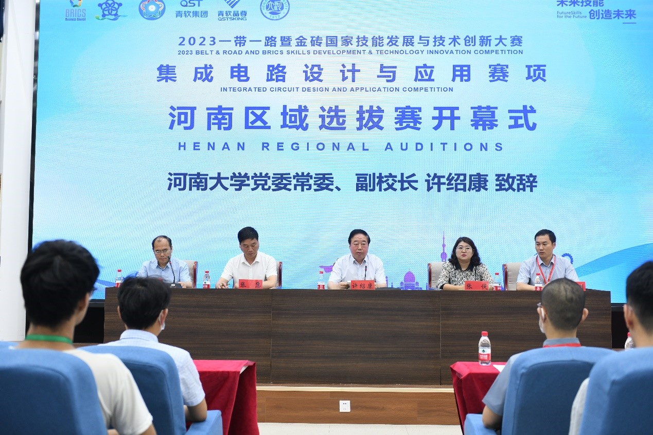 6月11日,2023“一带一路”暨金砖国家技能发展与技术创新大赛集成电路设计与应用竞赛(河南赛区)在河南大学举行。河南大学党委常委、副校长许绍康出席开幕式。来自河南大学、河南师范大学、新乡学院、华北水利水电大学、郑州轻工业大学的带队教师及参赛选手参加了开幕式。开幕式由物理与电子学院党委副书记刘寒冰主持。