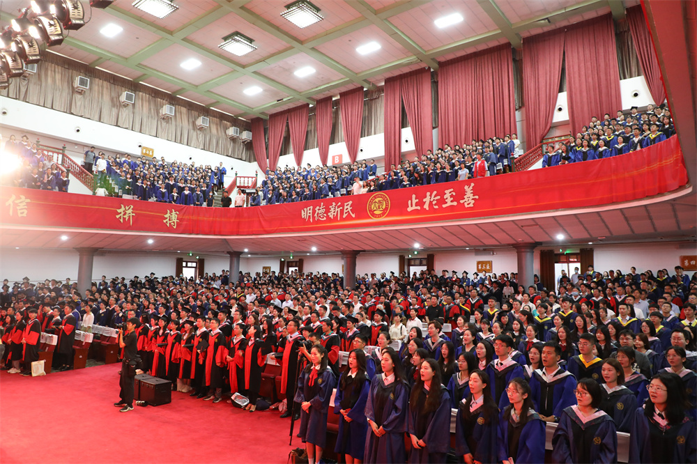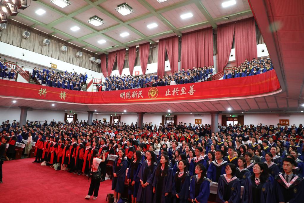 典礼开始前,师生们在大礼堂合唱《星辰大海》《我们都是追梦人》等歌曲。“海阔天空敞开温暖怀抱,我们都是追梦人”……在动感而富有青春活力的歌声中,同学们挥舞着双手,尽情地表达着对母校的不舍、对青春的致敬和对未来的期待。上午8点整,全体起立共唱国歌,毕业典礼正式拉开帷幕。