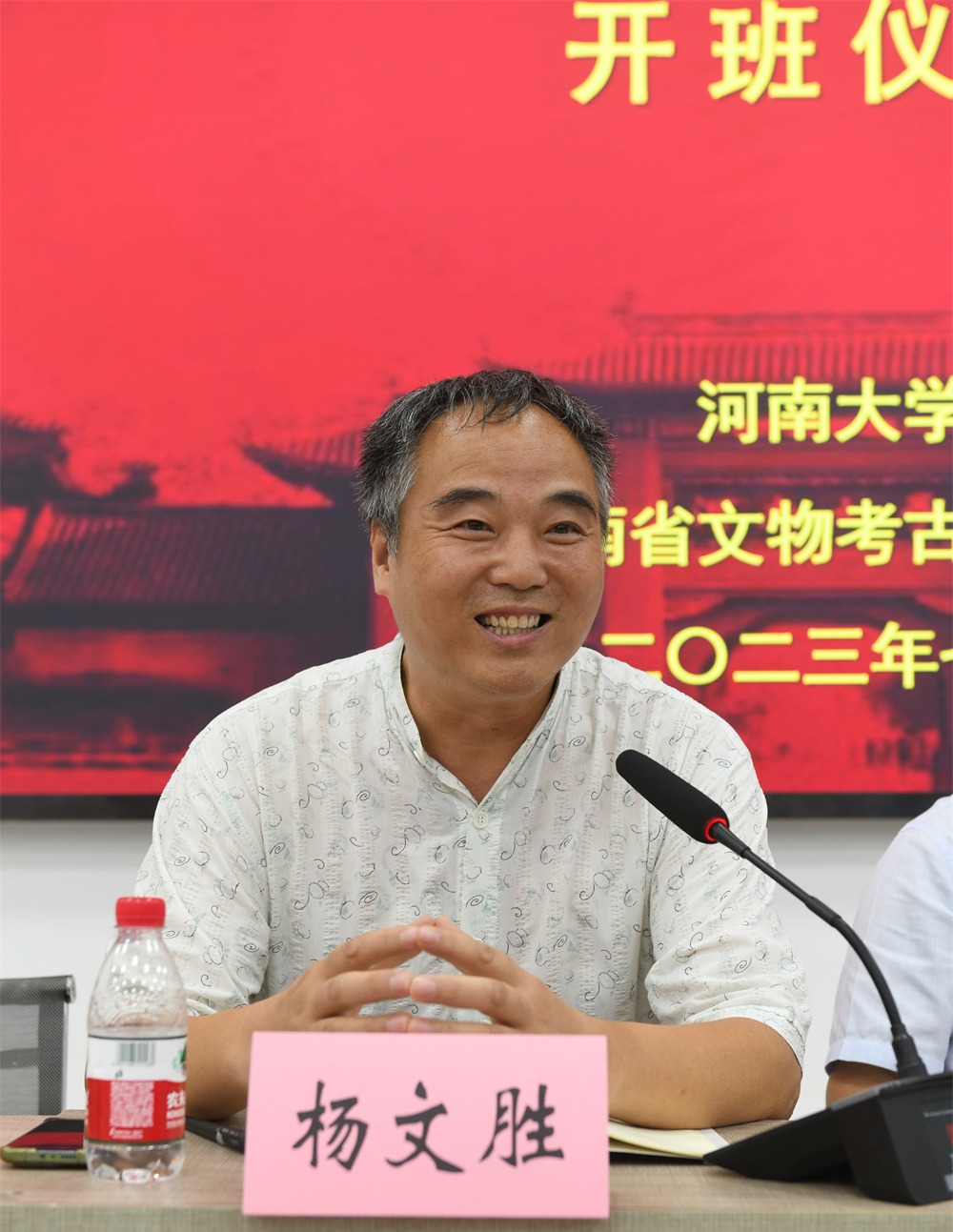 杨文胜代表河南省文物考古研究院致辞。他表示,在国家和省政府的大力支持下,夏文化研究取得了一系列重大研究成果,登封王城岗、禹州瓦店等遗址相关工作有序展开。在夏文化研究领域,要将考古探索和文献研究有机结合起来,发挥河南大学文史研究优势,并鼓励学员要潜心学术研究,成为夏文化研究的中坚力量。