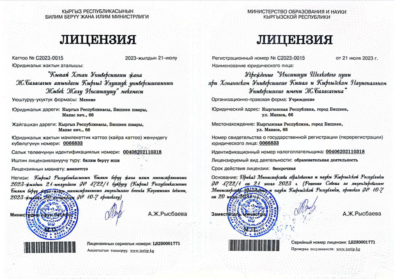 丝绸之路学院于2021年10月揭牌成立,于2022年9月联合招收56名新生。2023年7月11日,吉尔吉斯斯坦教育与科学部督导考察组专家到丝绸之路学院考察本科生招生资质相关情况,随后由吉尔吉斯斯坦政府外交部、国有资产部、财政部、教育科学部、文化部等九个部长参加的部长会议讨论通过并由总理签署后颁发许可证。