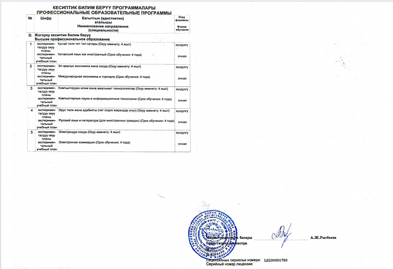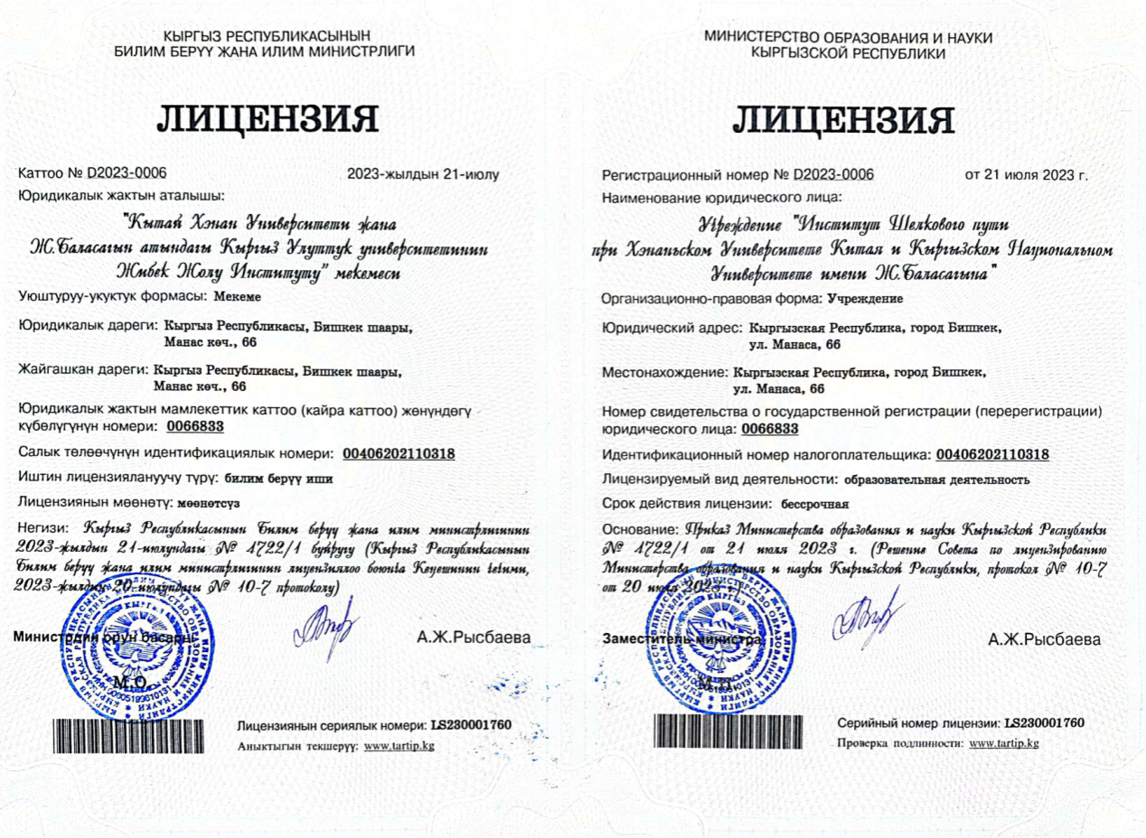 近日,我校与吉尔吉斯斯坦民族大学合办的中国河南大学——吉尔吉斯斯坦民族大学丝绸之路学院顺利通过吉尔吉斯斯坦教育与科学部对学院独立办学资质的考察,获得其颁发的办学许可证,取得独立办学资质。本次获批的五个本科专业分别为:汉语国际教育、国际经济与贸易、计算机科学与信息技术、俄语语言文学以及电子商务。