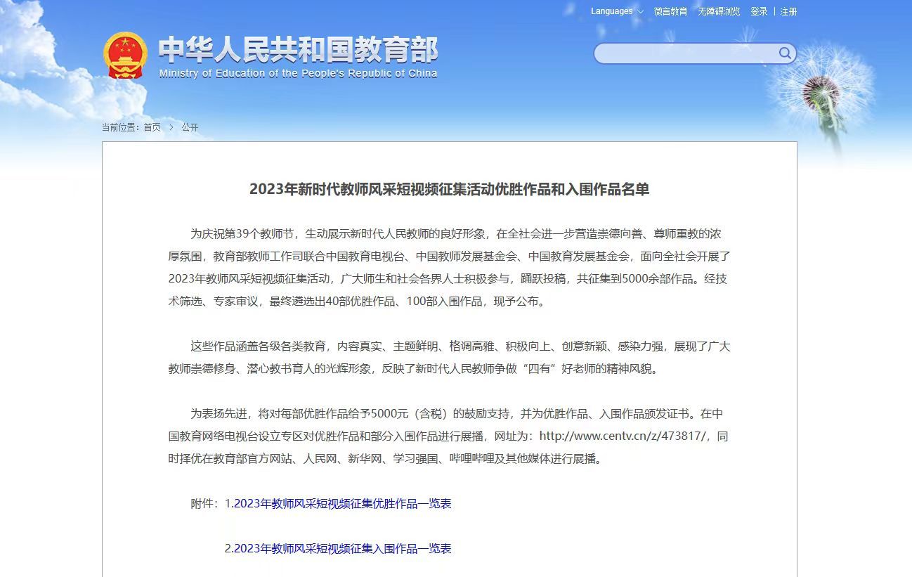 近日,教育部公布2023年新时代教师风采短视频征集活动优胜作品和入围作品名单,我校选送的2部作品《徐盛桓:耄耋之年,不负盛世》《乔家君:深爱这片土地》,从全国5000余部作品中脱颖而出,获评教育部“优胜作品”奖,我校也是全省唯一一所获此殊荣的高校。