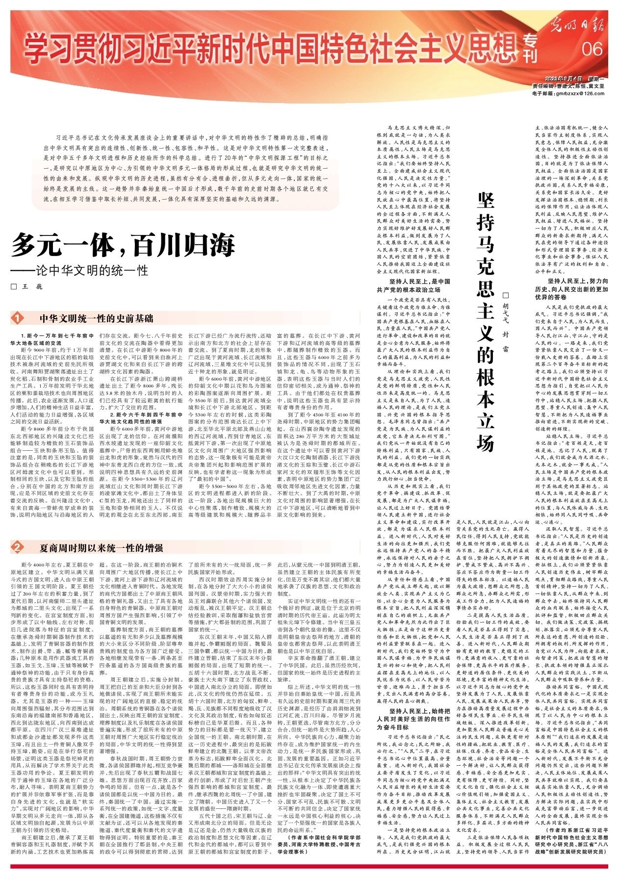 综上所述,中华文明的统一性并非始自秦始皇统一中国,而是具有久远的史前时期和夏商周三代的历史渊源,是经历了由涓涓细流到江河汇流、百川归海。尽管岁月流转,王朝更迭,尽管南方北方,分分合合,但统一始终是大势所趋,人心所向。中华民族向心力、凝聚力始终存在,成为维护国家统一的内生动力,是统一多民族国家形成、巩固、发展的重要基因。正如习近平总书记在文化传承发展座谈会上指出的那样:“中华文明具有突出的统一性,从根本上决定了中华民族各民族文化融为一体、即使遭遇重大挫折也牢固凝聚,决定了国土不可分、国家不可乱、民族不可散、文明不可断的共同信念,决定了国家统一永远是中国核心利益的核心,决定了一个坚强统一的国家是各族人民的命运所系。”