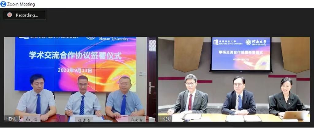 9月13日上午,我校与香港浸会大学交流合作协议线上签约仪式通过Zoom在线上举行。香港浸会大学常务副校长黄定发、副校长周伟立、内地发展办公室处长李进秋,河南大学副校长傅声雷、港澳台事务办公室副主任郭向前、副主任尚晋出席。签约仪式由李进秋主持。