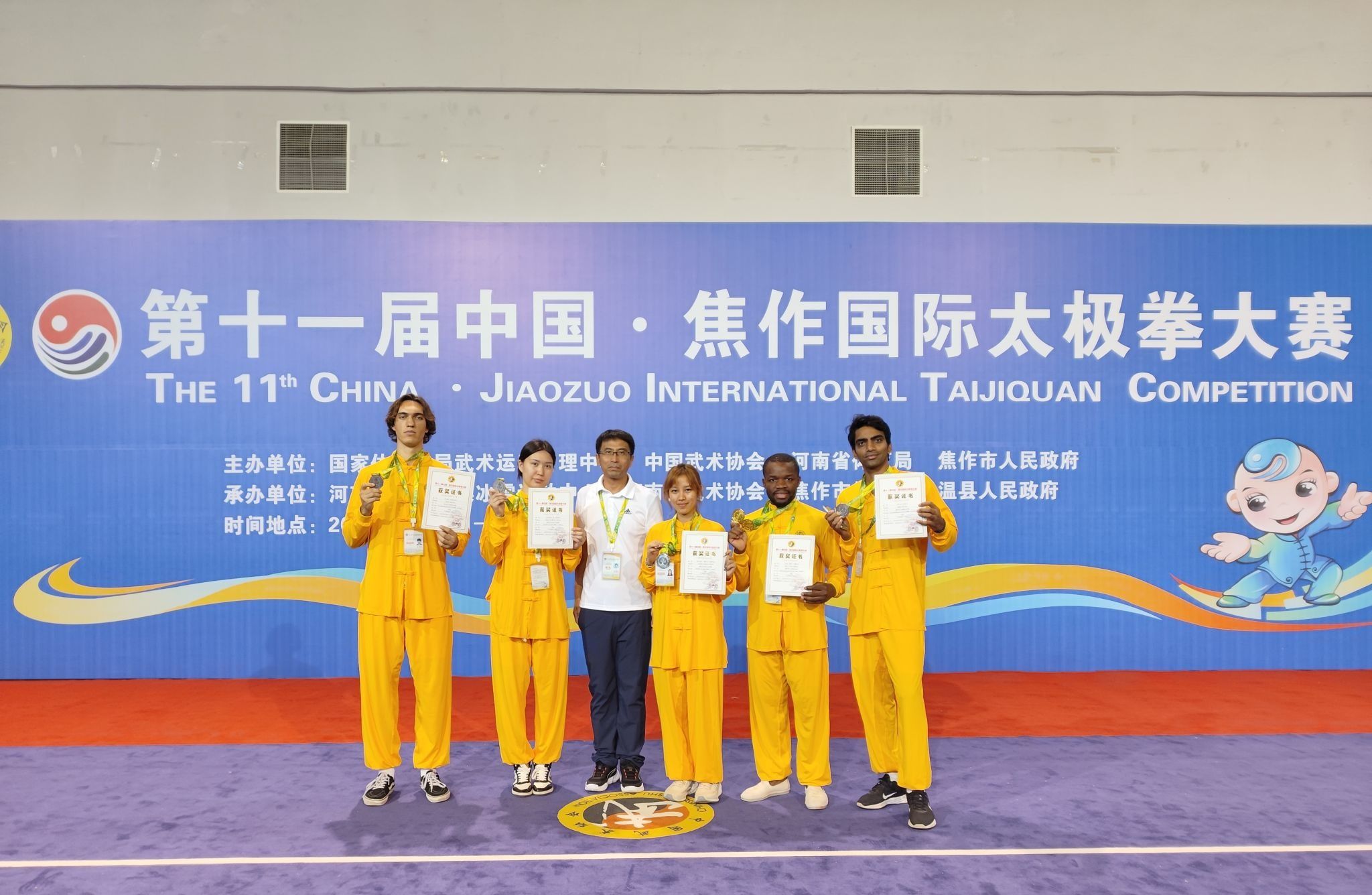 我校留学生武术队的5名队员在武术学院付宏山老师带领下经顽强拼搏取得2金、2银、2铜的佳绩。其中,博士生刘汴京获得境外男子C组其它太极剑、境外男子C组规定太极拳2枚金牌;扎米利亚·卓尔多舍娃、维南西亚·莫妮卡·安德里亚分获境外女子C组24式太极拳银牌和铜牌;萨加尔·拜索亚、丹尼斯·安德列耶夫分别获得境外男子C组规定太极拳银牌和铜牌。