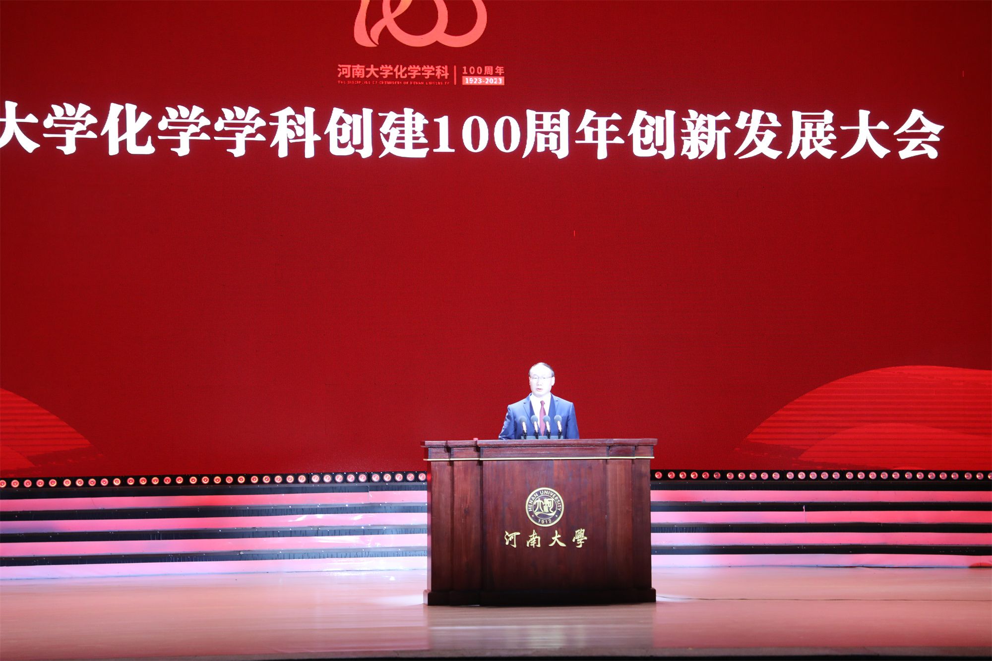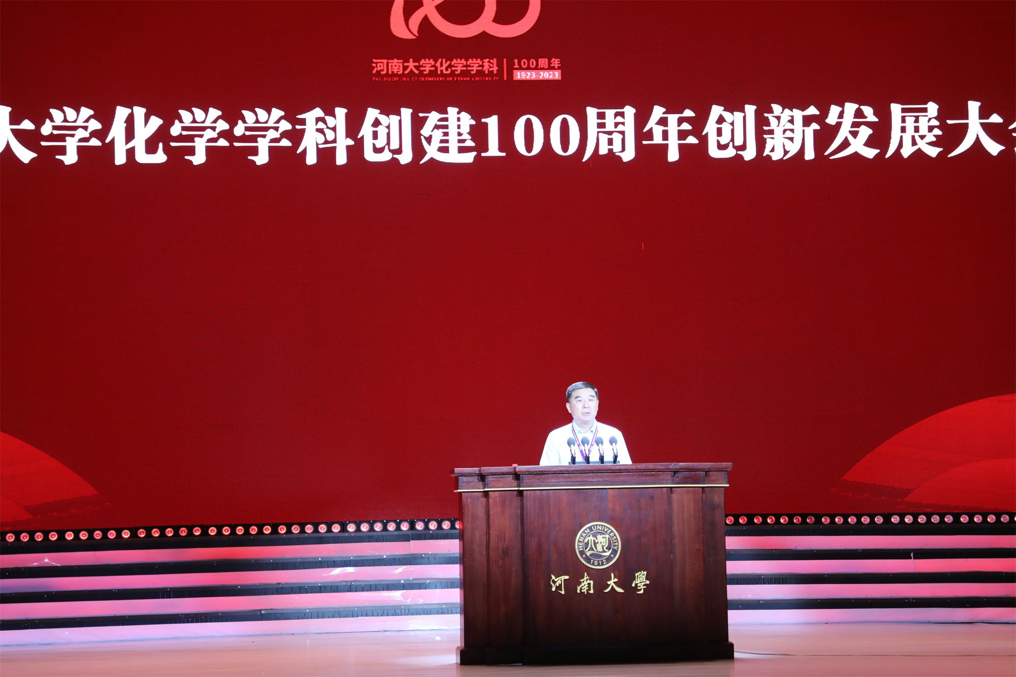 省教育厅党组成员、一级巡视员、副厅长刁玉华致辞,总结了河南大学化学学科在百年发展历程中为河南省乃至全国教育事业作出的突出贡献,指出站在新的历史起点上,河南大学化学学科作为学校优势学科,理应在“双一流”“双航母”建设中发挥重要作用,在高层次人才队伍建设、开展原始创新和“卡脖子”关键技术研究、创建一流平台、培养一流人才等方面力争更大突破,推动河南高等教育起高峰,为河南省经济社会低碳智能转型和可持续发展、建设国家创新高地提供更多人才支撑和智力支持。