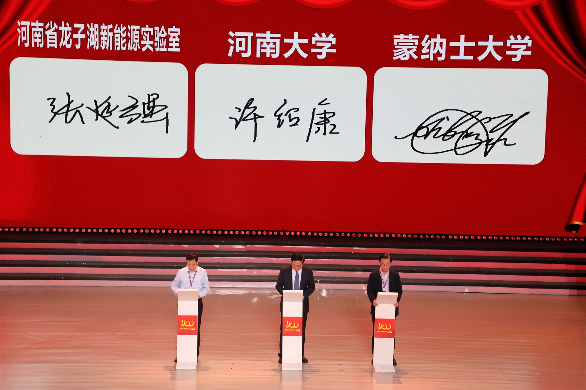 大会还分别举行了河南省绿色低碳研究院揭牌仪式和河南大学化学科学部揭牌仪式。在签约环节,河南大学化学学科与蒙纳士大学、龙子湖新能源实验室、中石化碳产业科技股份有限公司、中国石油化工股份有限公司中原油田、河南能源化工集团、平高集团、河南平煤神马集团等多家单位签署了战略合作框架协议。