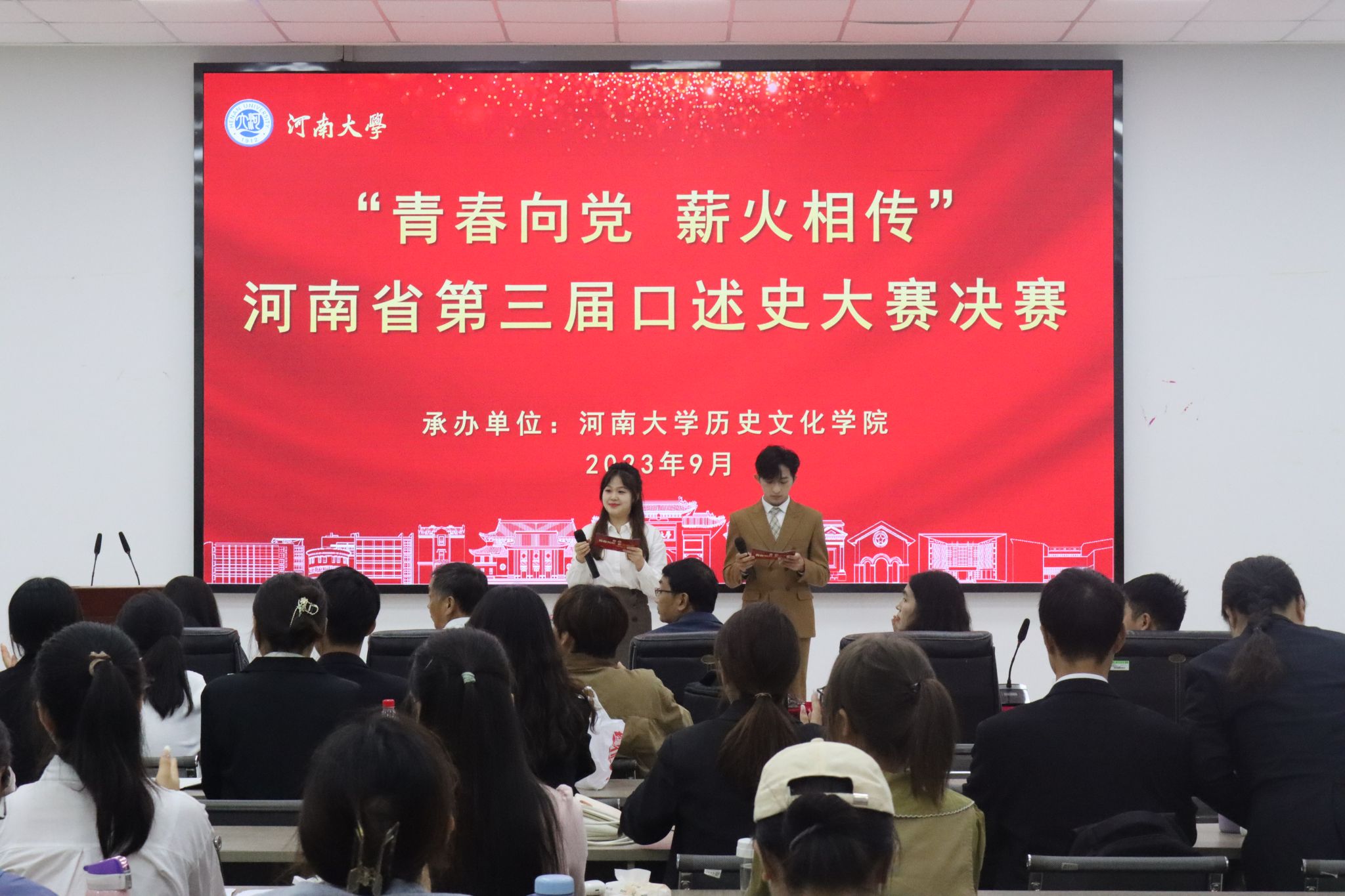 9月24日,由河南省历史学会、河南大学党委宣传部、河南大学党委学生工作部、河南大学党委研究生工作部主办,河南大学历史文化学院承办的河南省第三届口述史大赛决赛在河南大学明伦校区科技馆一楼报告厅举行。河南大学党委常委、副校长孙君健,中华口述史学会副会长、中国社会科学院历史理论研究所副所长左玉河,河南大学党委组织部副部长郭淼,党委宣传部副部长陈旭,党委学生工作部副部长、学生处副处长李平,历史文化学院党委书记张占党、党委副书记周文凯和教师代表出席活动。