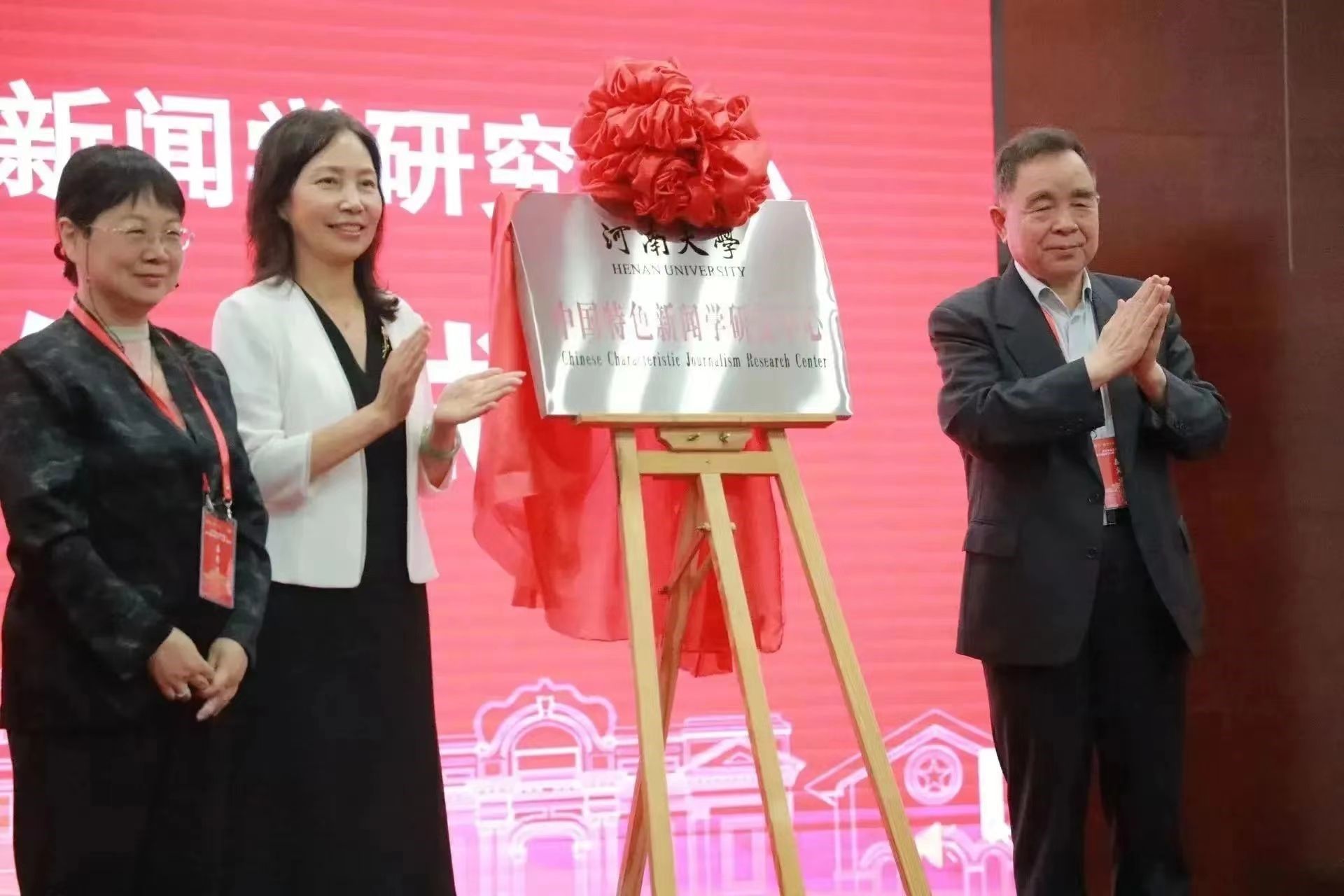 随后,柳斌杰、王润泽、谭贞共同为“河南大学中国特色新闻学研究中心”揭牌。河南大学出版社原总编辑杨国安教授、现任总编辑孔令刚教授向河南大学新闻与传播学院、河南大学中国特色新闻学研究中心赠书。