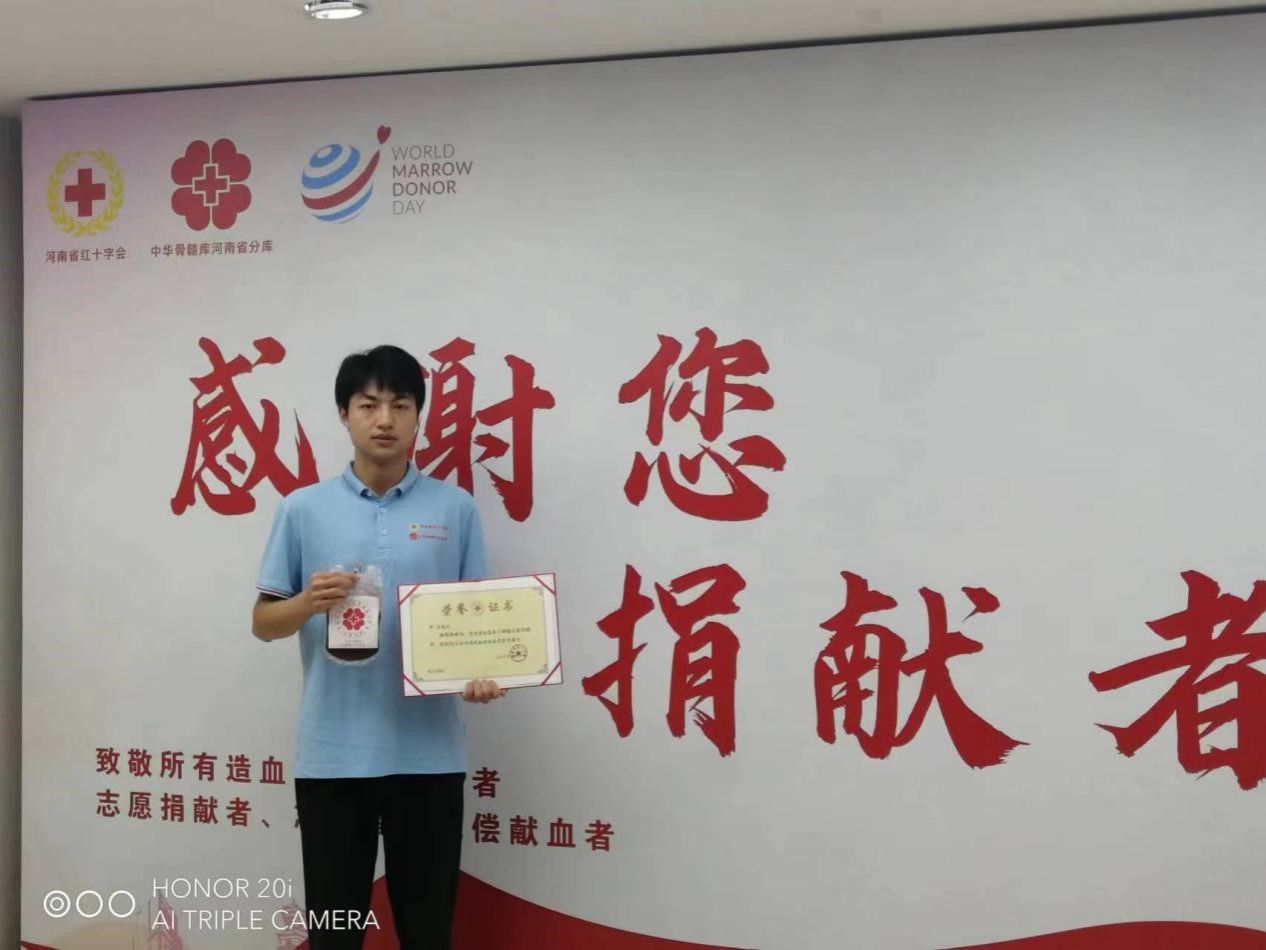 9月26日,河南大学数学与统计学院研究生李卓成功在郑州捐献了造血干细胞,为一位血液病患者送去重生的希望。