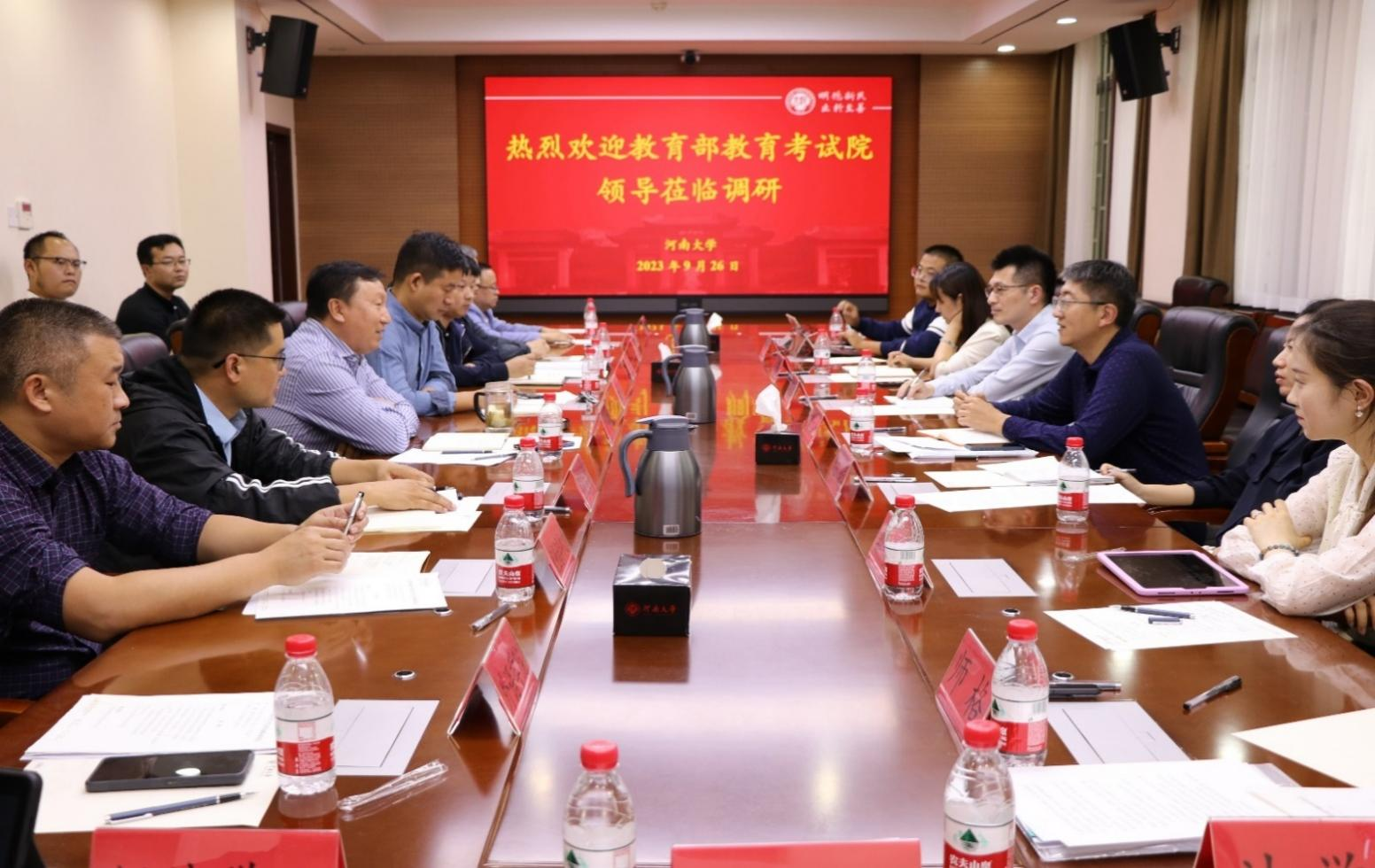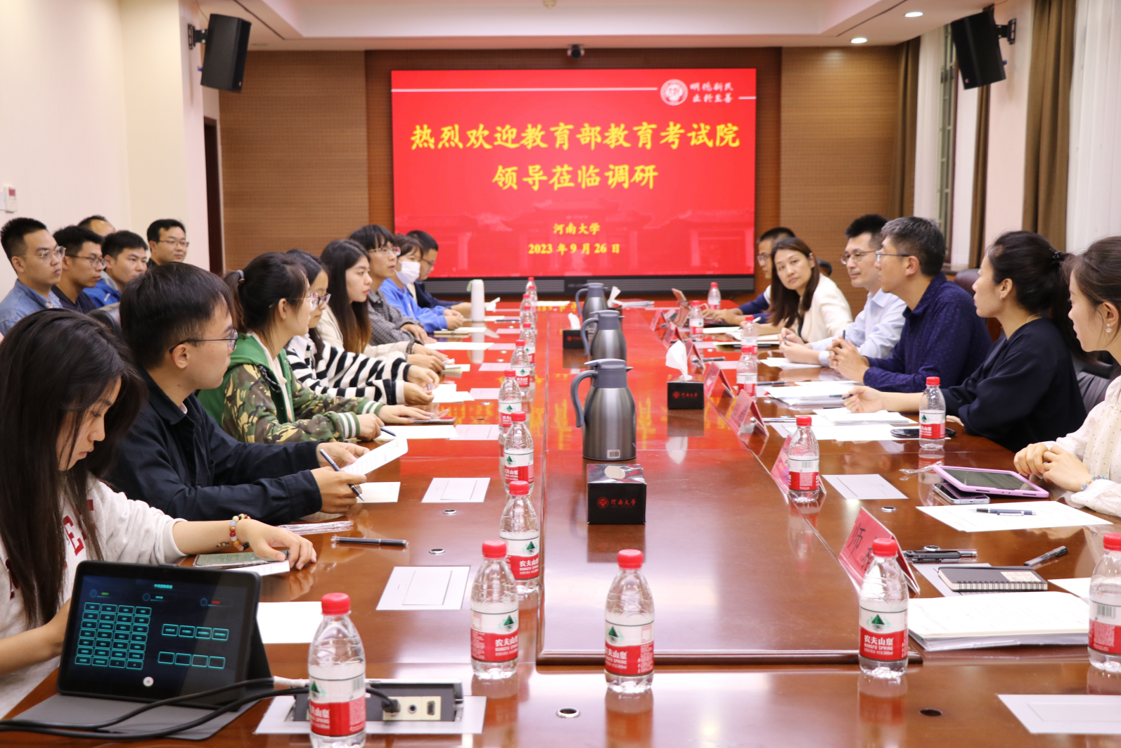 为进一步深入学习贯彻习近平新时代中国特色社会主义思想以及党的二十大精神,促进新时代硕士研究生招生考试的高质量发展,9月26日下午,教育部教育考试院命题二处副处长邢博特、副处长白娟、命题三处副处长赵祖华,河南省教育考试院研招处处长王予洁等一行7人来校,就研究生考试学情进行专题调研与座谈。参加座谈的有我校教务处、研究生院、就业创业指导中心、导师代表、相关部门管理人员代表、学生代表等。会议由河南大学副校长苗雨晨主持。