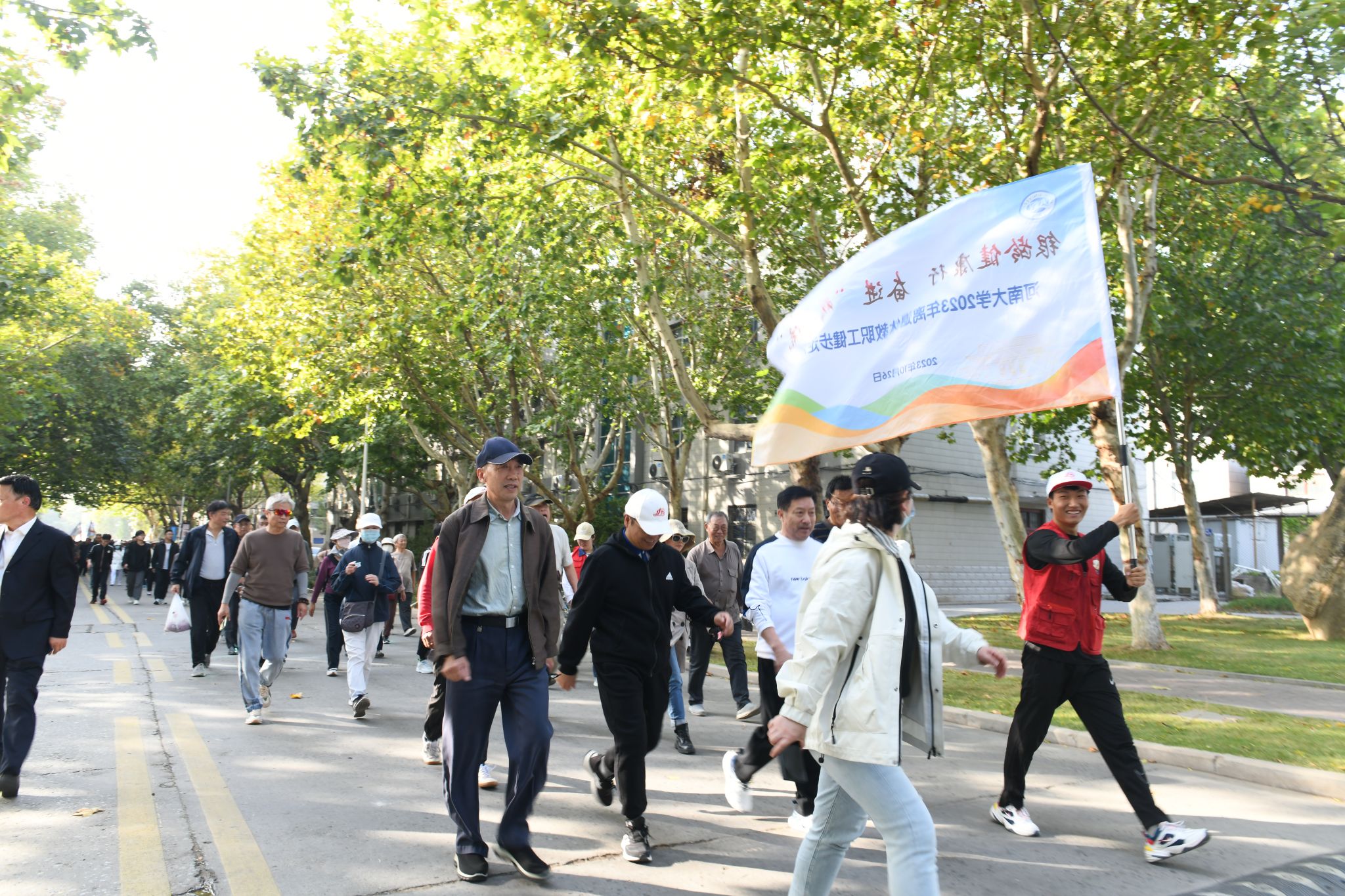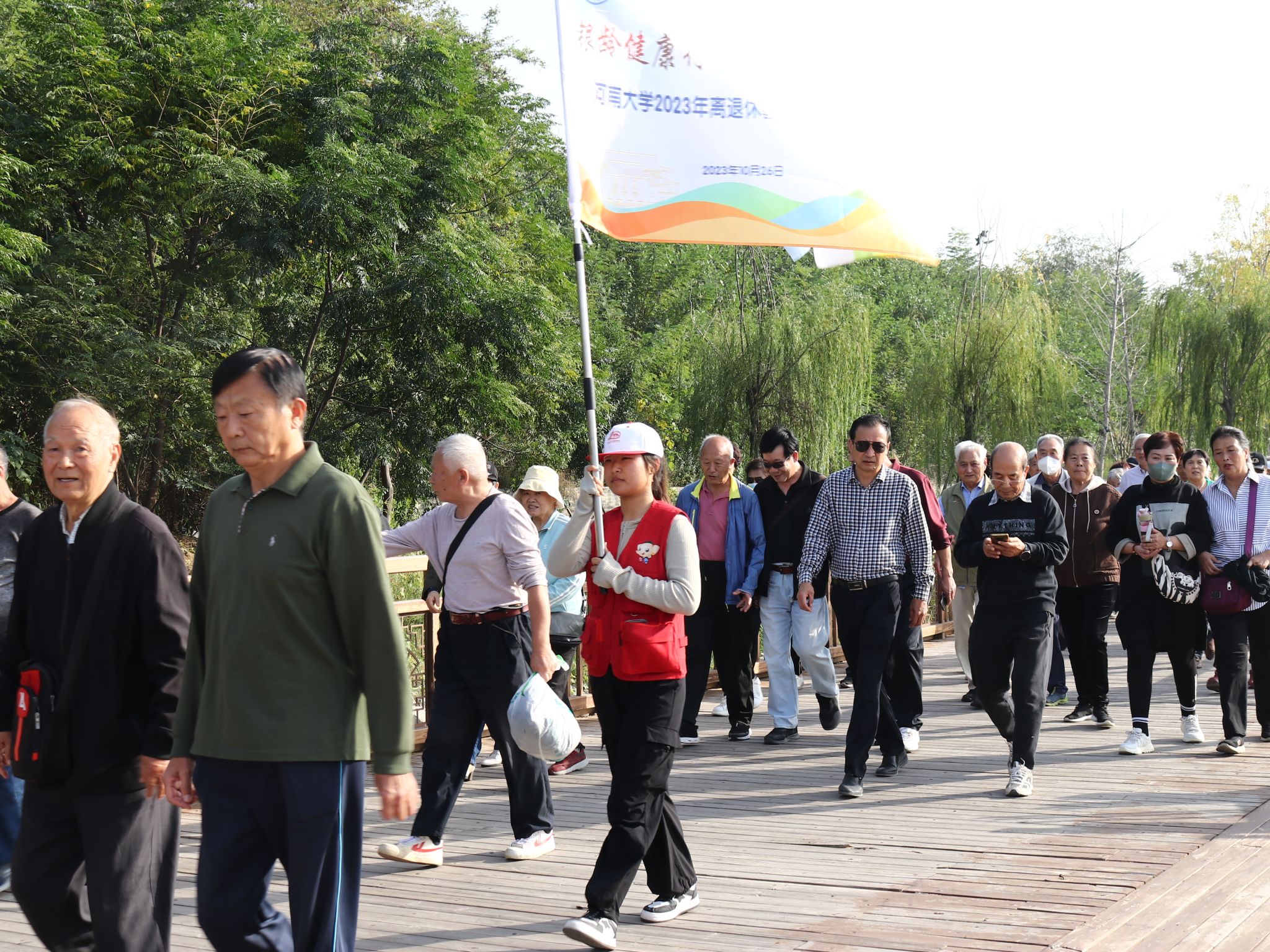 此次活动共有1300余名离退休教职工参加,以大礼堂广场为起点,通过铁塔湖栈道进入铁塔公园,从铁塔公园北门返回学校,全程共2.5公里。