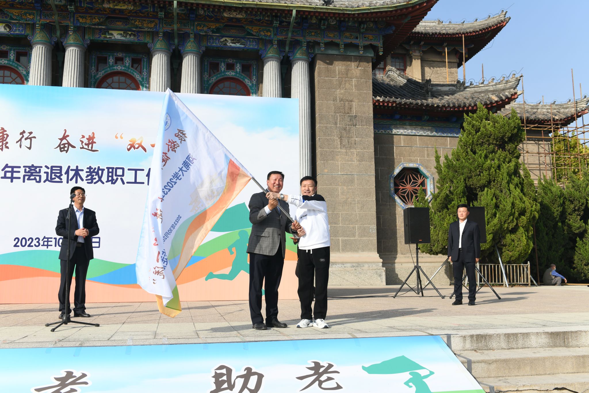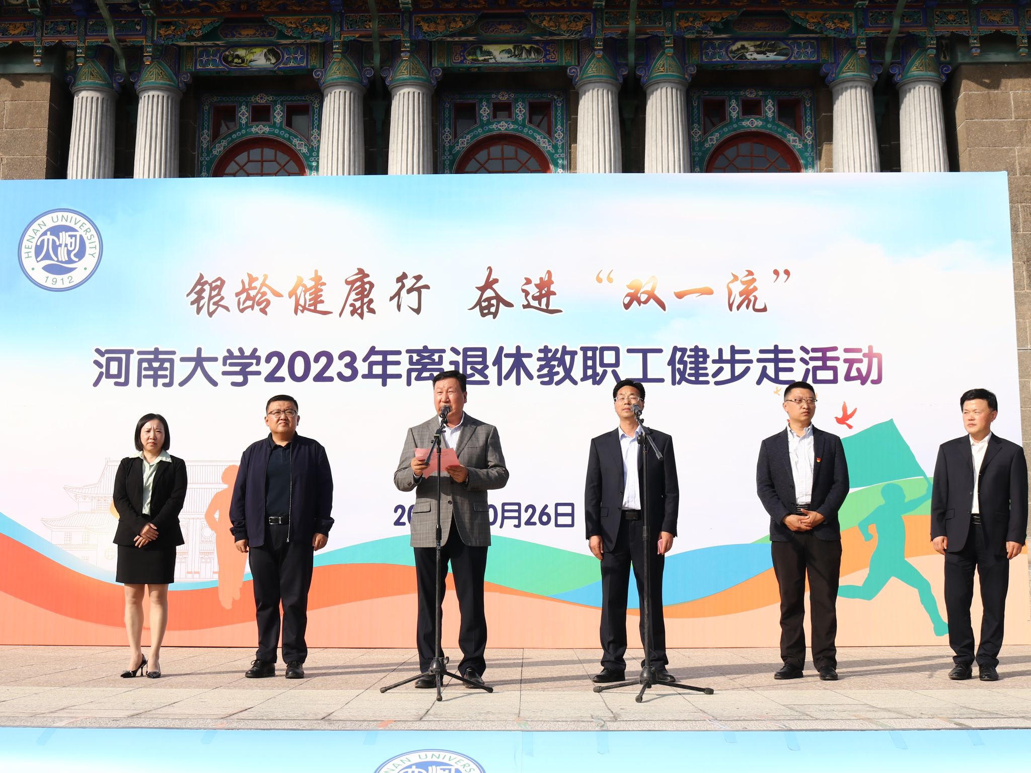 十月金菊香满庭,秋风送爽好时节。10月26日下午,明伦校区大礼堂广场彩旗飘扬,人声鼎沸。由离退休工作处主办的敬老月系列活动之一“银龄健康行 奋进‘双一流’——2023年离退休教职工健步走活动”在明伦校区举行。校党委常委、副校长苗雨晨出席开幕式并致辞。校党委办公室、离退休工作处相关负责同志参加活动。离退休党委书记、离退休工作处处长牛林豪主持活动开幕式。