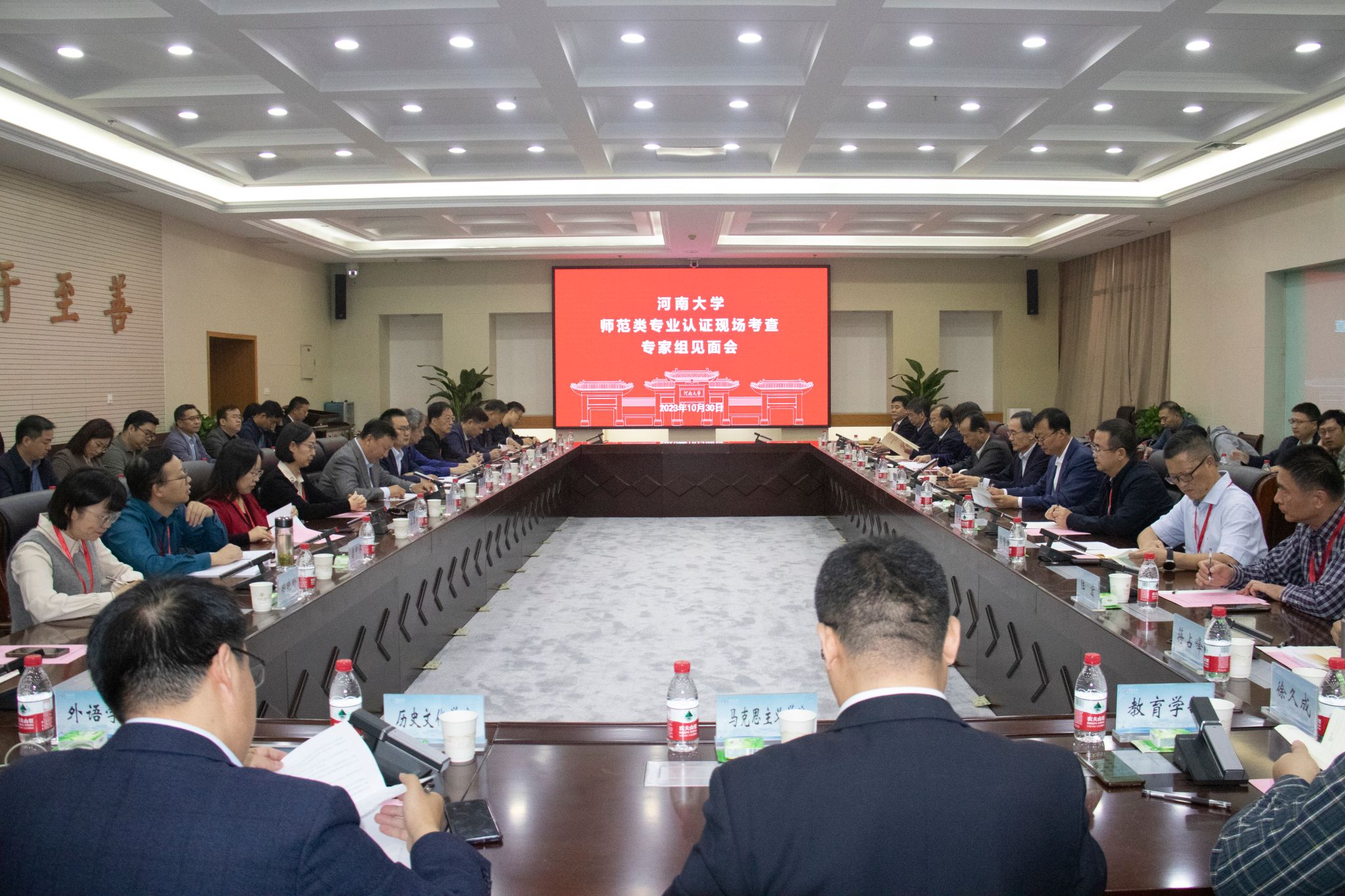 10月30日上午,在金明校区图书馆三楼会议室举行专家见面会。各专业认证专家组、河南省教育厅教师教育处副处长张会敏、河南省教育评估中心副主任张新民教授、河南大学副校长苗雨晨教授、相关职能部门负责同志以及相关学院负责人参会。会议分为两个阶段,分别由苗雨晨和李向农主持。