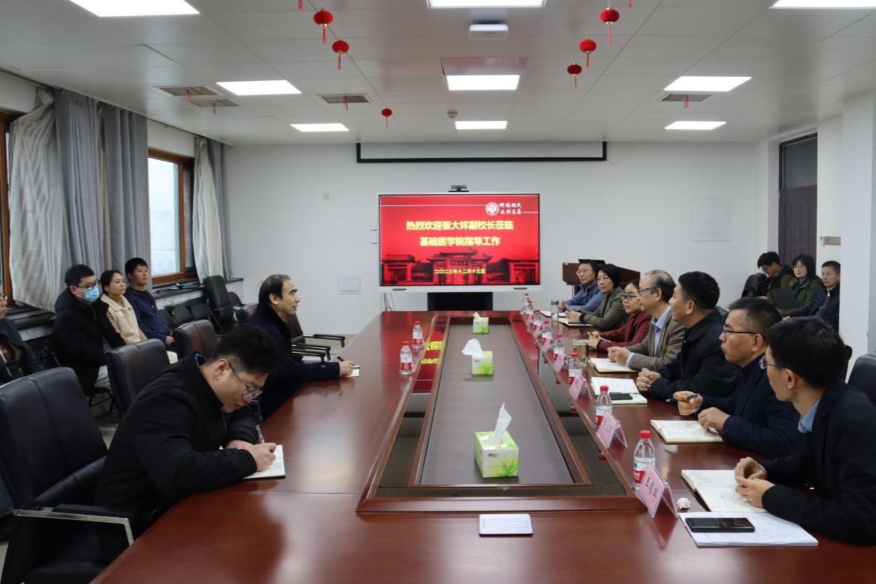 12月13日,副校长、医学院院长崔大祥到基础医学院调研指导工作,并召开座谈会。基础医学院领导班子成员、学科系主任、科研平台主任、高层次人才及教师代表,抗体药物开发国家地方联合工程实验室主任、副主任参加座谈交流。座谈会由基础医学院党委书记傅侃达主持。