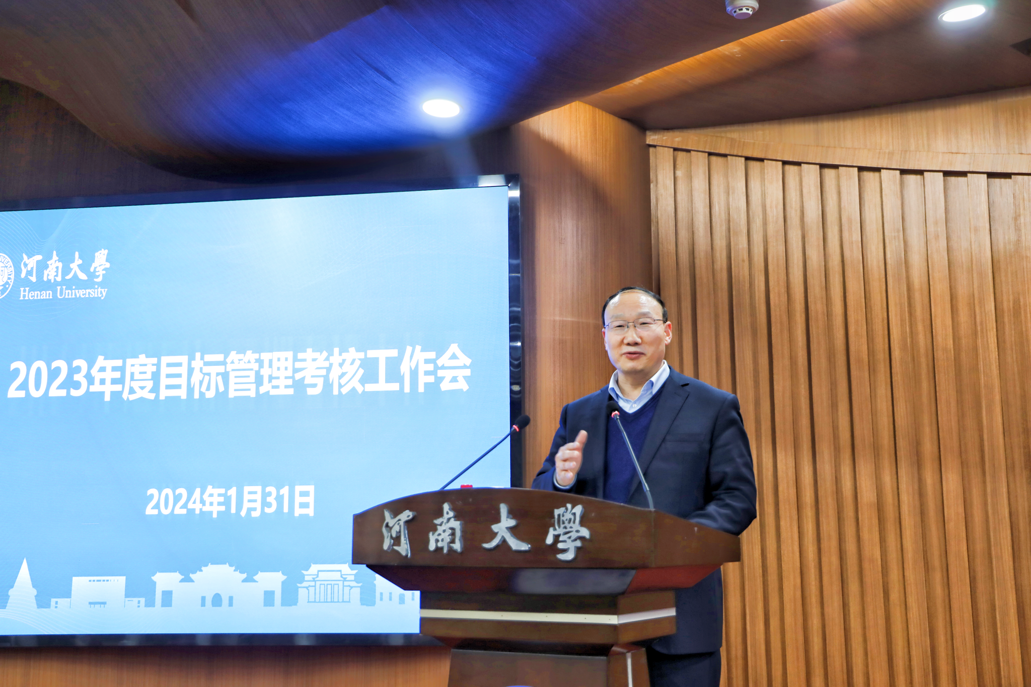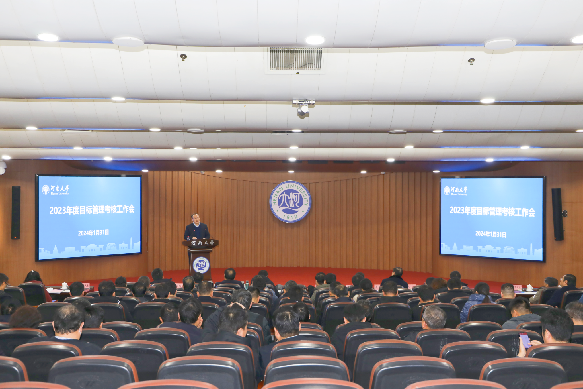 校长张锁江出席会议并发表讲话。他对各部门各学院在考核中展现出的奋勇争先的良好精神风貌给予高度评价,对全校上下过去一年以目标管理责任制为牵引、取得的丰硕成果表示高度肯定,对大家一年来付出的不懈努力、作出的巨大贡献表示衷心感谢!他指出,实施目标管理责任制是学校深化体制机制改革的一项重大创新举措,是学校加快“双一流”“双航母”建设步伐的有力助推器。就进一步落实好目标管理责任制、推动学校事业高质量发展,张锁江提出五点意见:一是要深入学习贯彻习近平总书记关于教育、科技、人才、产业变革及大科学时代的系列重要论述。深刻理解教育和科技在中华民族伟大复兴进程中的关键作用,充分认识到河大作为“双一流”“双航母”高校所承载的振兴河南高等教育的历史使命,找准发展定位,探索独特道路,努力实现理念先行、换道超车;要坚持和加强党对学校的全面领导,坚定不移推进全面从严治党、全面从严治校,维护好学校安全稳定与高速发展的良好势头,推动学校事业发展再上新台阶。二是要深刻认识学校实施目标管理责任制的重大意义。推行目标管理责任制是学校实现治理体系和治理能力现代化进程中的一个重大标志性事件,对推动学校高质量发展具有重大现实意义。要将目标管理责任制作为高质高效推进各项工作的根本抓手,持续不断地将目标管理责任制做实做细,并与绩效考核、干部任用等紧密结合;要聚焦人才、经费、平台、成果等关键指标,推动院办校、职称评定等系列改革创新,进一步激发广大教职工争创一流的活力,促进学校人才结构、经费结构、科研模式、科研成果、治理体系、安全体系、学术生态等方面的根本性转变;要成立工作专班,坚持导向明确、重点突出、定性定量,重新核定2024年度各单位发展指标。三是学校各级领导干部和科研骨干要加强对国家和省委政策的学习、研究和贯彻,提升主动攻坚克难的担当意识和本领能力。要坚定不移贯彻执行党和国家、省委省政府的决策部署,将理论学习与工作实际紧密结合,做到思行合一、率先垂范、担当实干;要牢固树立世界一流理念、切实践行世界一流标准,严格要求自己,不断提升工作能力和水平,在学校各项事业中不断实现超越、突破和引领;要坚定不移推进干部队伍年轻化,让年轻干部多磨练、早担当,在持续干事创业中砥砺成长、担当大任。四是要持续营造积极向上、公平公正的学术生态和文化环境。要坚决摒弃惯性思维,尊古不复古,守正不守旧,以发展的眼光、创新的举措应对新挑战和新变化;要实事求是、自信自立,遵循办学及科技创新的客观规律;要深刻理解多园区协同办学的重大意义,以开放的心态和饱满的热情积极支持学校各项战略决策与规划布局;要将“自信、拼搏、开放、创新”的新河大精神落实在干事创业的具体行动中,汇聚团结奋进的正能量。五是要着力构建校园“大安全”防护体系。牢固树立“安全第一”的理念,进一步织密扎牢多校区办学系统防护网,从实从细做好假期值班值守、防范应对低温雨雪天气等工作,全力守护师生生命和财产安全,确保大家度过一个安全、幸福、快乐的春节。