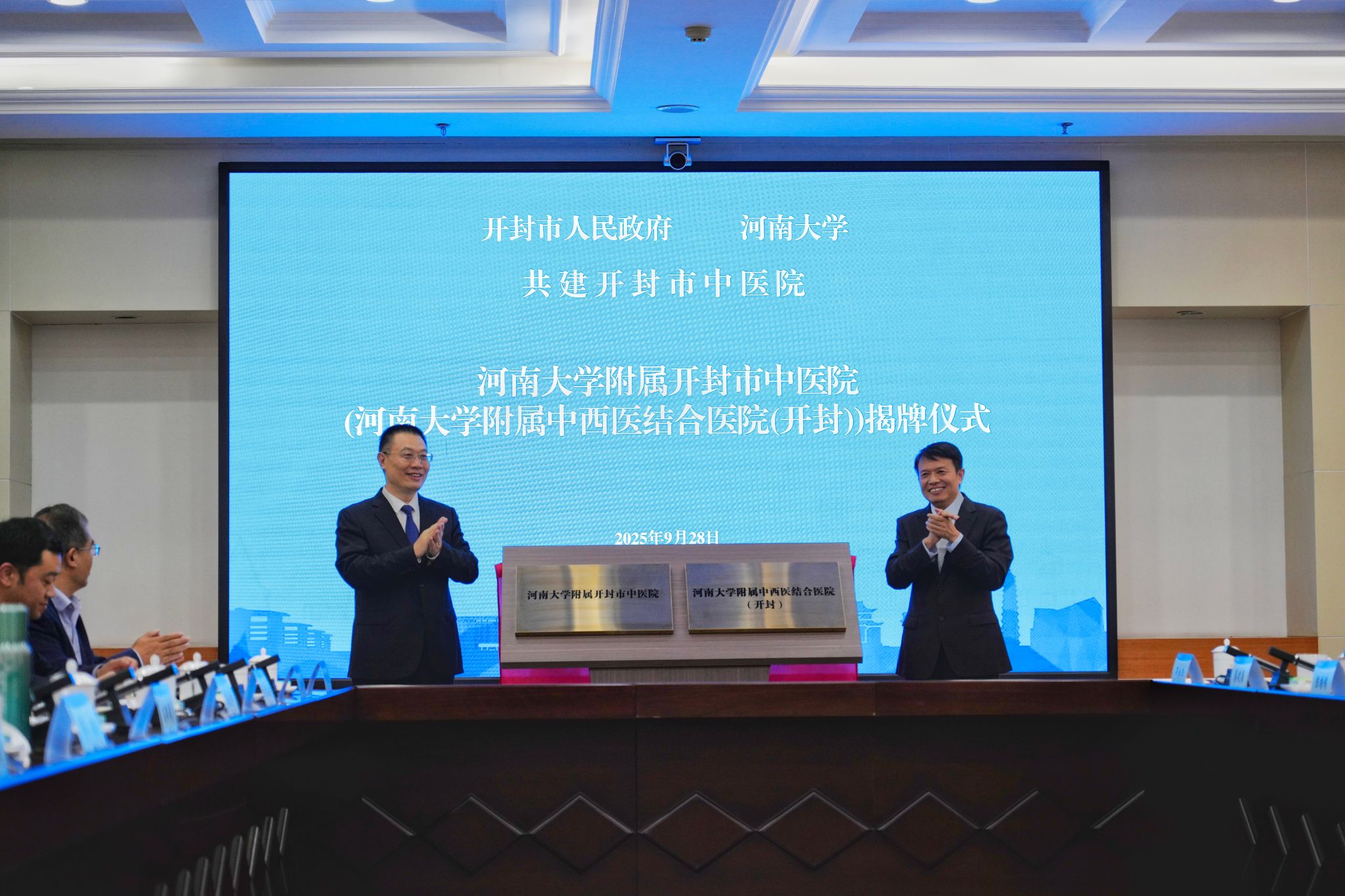 秋实盈仓,再启新程。9月28日,上海中医药大学、河南中医药大学、河南大学共建中西医结合学院暨开封市人民政府、河南大学共建河南大学附属开封市中医院(河南大学附属中西医结合医院(开封))签约揭牌仪式在我校金明校区图书馆举行。上海中医药大学校长季光,开封市委书记高建立,开封市委副书记、市长吴海燕,河南中医药大学校长王耀献,河南大学党委书记季波,开封市委常委、组织部部长、市委教育工委书记杨克俊,开封市副市长刘震,河南大学校领导苗雨晨、乔梁、崔大祥等共同见证这一历史性时刻。各方代表共同签署了战略合作框架协议,并为中西医结合学院和附属医院揭牌。