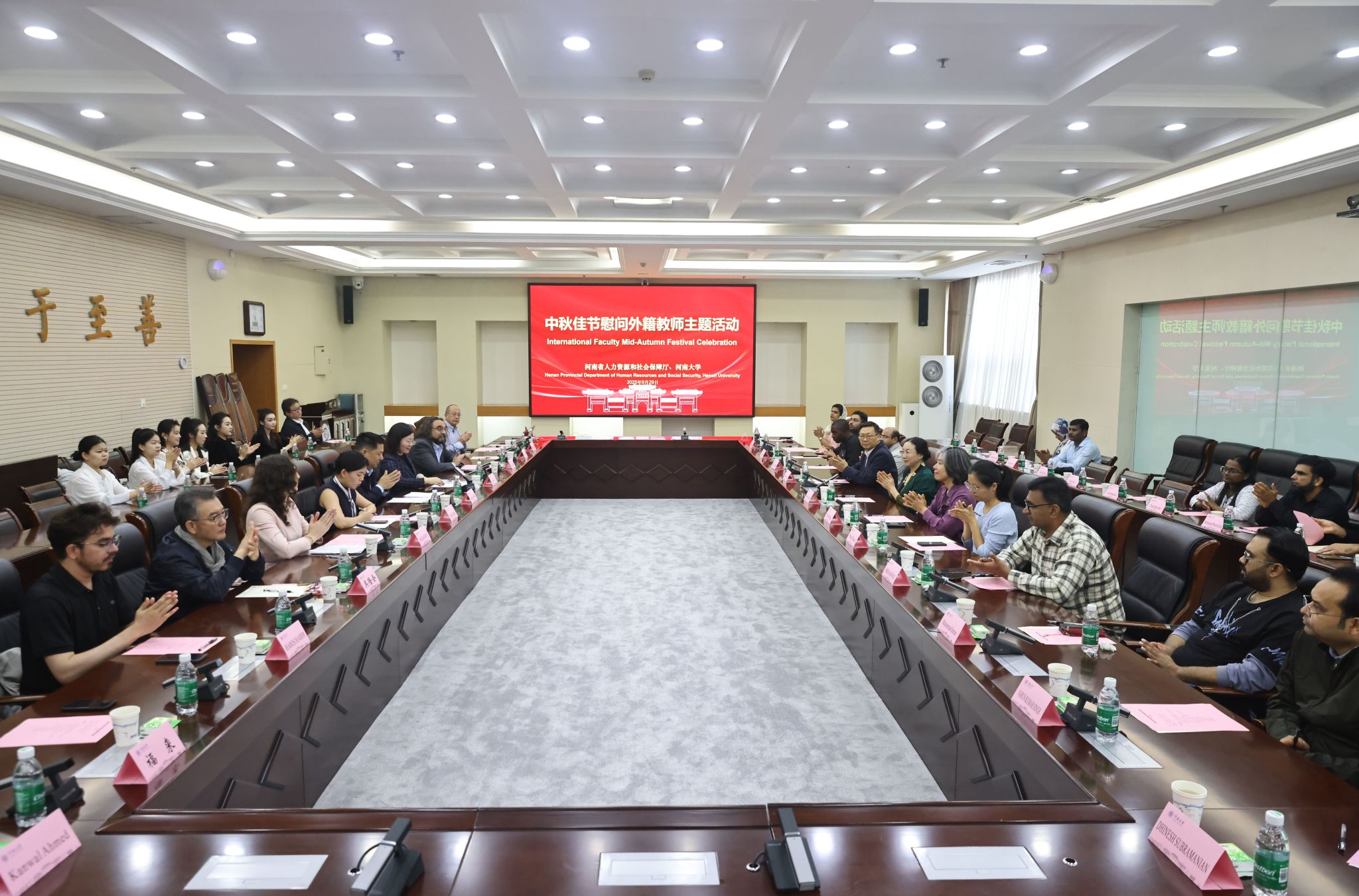金秋送暖,情满河大。9月29日上午,河南省人力资源和社会保障厅(以下简称“省人社厅”)与我校联合举办中秋慰问外籍教师主题活动。省人社厅外国专家服务处处长、一级调研员吴会贤一行四人来校,与来自美国、德国、俄罗斯等11个国家的27名外籍专家欢聚一堂,共庆中秋、畅叙情谊。我校副校长张礼刚出席活动,国际合作与交流处副处长李秋叶主持活动。