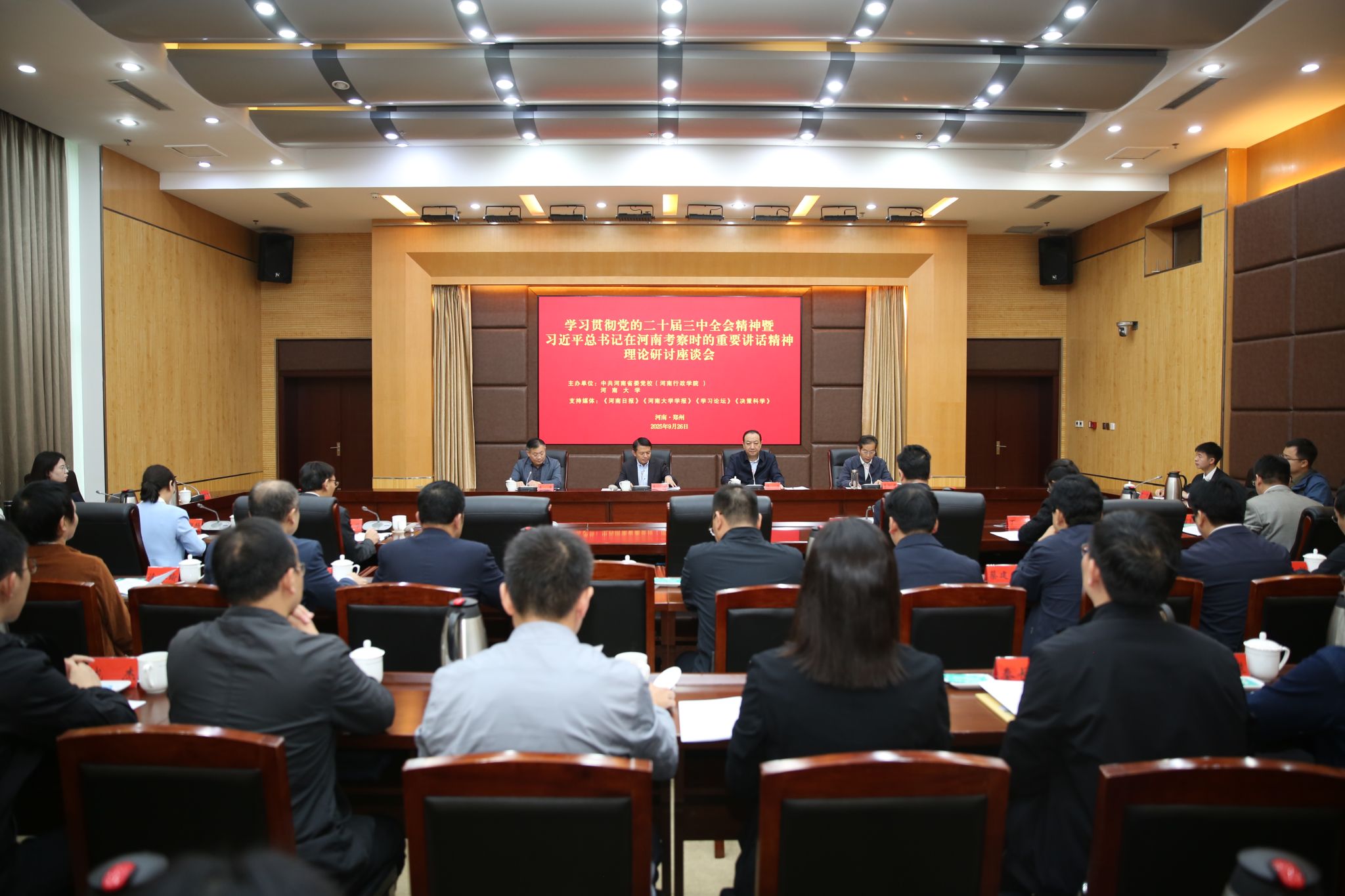 9月26日,我校与中共河南省委党校(河南行政学院)共同举办的学习贯彻党的二十届三中全会精神暨习近平总书记在河南考察时的重要讲话精神理论研讨座谈会在省委党校会议中心多功能厅召开。河南大学党委书记季波,中共河南省委党校(河南行政学院)常务副校(院)长、党组书记张涛出席并致辞,河南大学党委副书记李平出席,中共河南省委党校(河南行政学院)校务委员、党组成员李剑力主持座谈会。