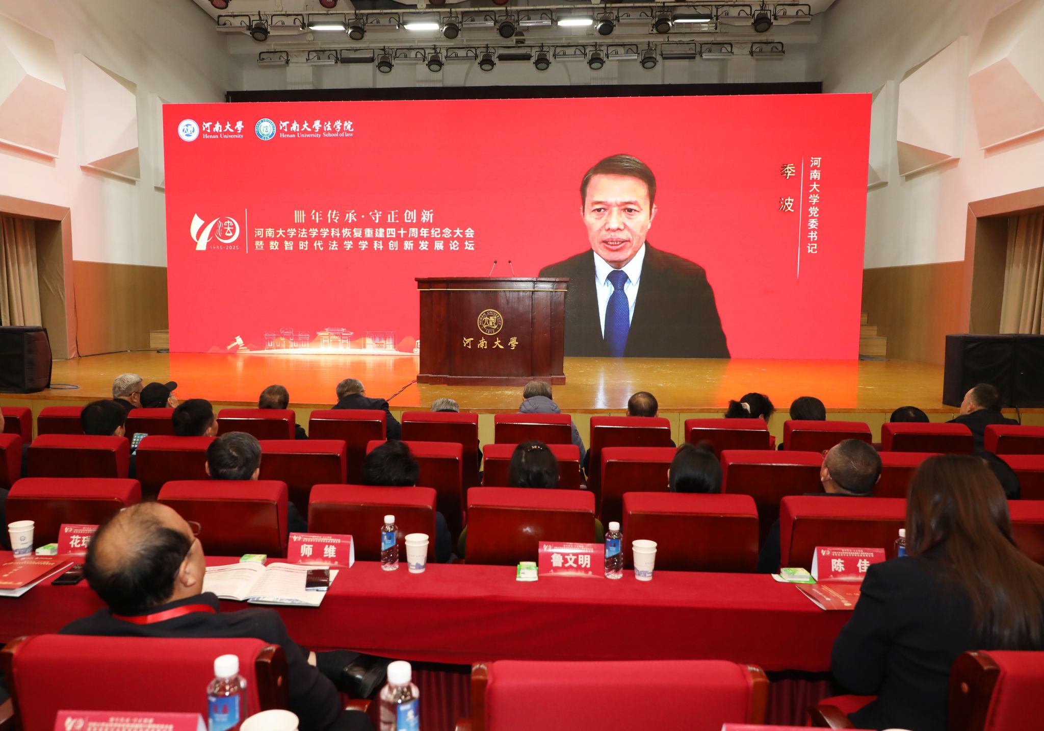 12月6日上午,河南大学法学学科恢复重建四十周年纪念大会暨数智时代法学学科创新发展论坛在明伦校区音乐厅举行。教育部高等学校法学类专业教学指导委员会主任委员徐显明教授,河南省人民检察院党组副书记、副检察长田凯应邀出席,兄弟院校代表、法律实务界代表、校友代表,河南大学党委书记季波、党委副书记李平、副校长白莹,以及校内单位代表、法学院师生300余人齐聚一堂,共同回顾河南大学法学学科自1985年恢复重建以来的发展历程,擘画未来发展蓝图。大会由法学院党委书记祝晓路主持。