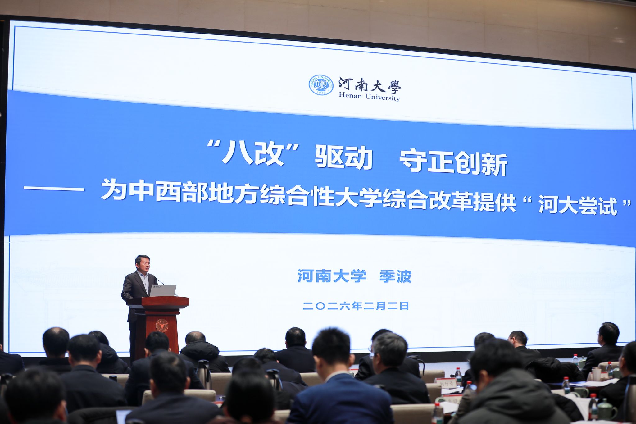 浙江大学、大连理工大学、重庆大学、华南理工大学、首都医科大学、河南大学和上海市、陕西省、黑龙江省教育行政部门、中国高等教育学会秘书处等10个单位在大会作交流发言。作为唯一一所非985、非部属地方高校发言代表,我校以《“八改”驱动,守正创新——为中西部地方综合性大学综合改革提供“河大尝试”》为题作代表发言。聚焦综合改革“河大做什么”“做了什么”“下步做什么”,党委书记季波介绍了我校综合改革“4+3+16+30”总体布局,即扎根中原的思政体系改革、产教融合的育人体系改革、新工新医的学科体系改革和AI赋能的教育形态改革“四部类”,人事改革、科研改革、治理体系改革“三体系”,共16个改革事项、30条改革举措。他详细介绍了河南大学正在进行的改革,一是八个新理念改革,改观念、改定位、改主线、改模式、改思路、改志向、改准则、改风气;二是人才培养供给侧改革,建设小而精、高起点、研究型的新工科“9+3”、新医科“4+5”学院/研究院;三是人才培养范式改革,构建“学院+研究院+基地”产教融合育人新范式,启动“2+2+N”教学改革,实施本硕博贯通培养,设立“林伯襄”实验班等;构建“招培就”一体化培养体系,启动创业领航计划等;四是人才培养支撑体系改革,强化高水平人才支撑,引育并举实施“123人才强校工程”,高层次人才破百、翻两番,2025年自主培养20年未有的新突破国家杰青1人,0-1历史性突破长江学者1人,自主培养国家级高层次人才达23人,占新增量的1/3;强化高水平科研支撑,实施“PI团队”科研,全年发表CNS论文5篇,排名全国高校第36,国家自然科学基金增长53.8%,增速前所未有;强化高水平平台支撑,全国重点实验室实现1到4、翻两番;五是AI赋能的人才培养形态改革,郑州校区大学堂建设6万平方米未来学习中心,新增国家一流课程7门,入选国家规划教材7部,全省第一,国家教材奖实现0-1的历史性突破,全省1/3。季波指出,学校将2026年确定为“改革攻坚年”,重点推进三大系统改革,一是校院两级协同推进“院为实体”改革,激发两个积极性、动力和活力;二是高水平师资队伍“分类评价、分类激励、分类发展”改革,构建以实际贡献为导向的用人和人才激励制度;三是人才培养“学在河大”综合改革,构建立德树人、AI赋能的教学教育育人新模式。河南大学愿以今日之奋斗,为高等教育综合改革提供“河大方案”。发言受到了教育部和兄弟高校的好评,学校2025年取得的改革成效和思政育人等典型案例受到了教育部领导的大会表扬。受会议委托,季波还主持了13家试点高校分组座谈会。