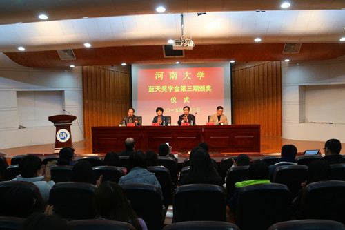 2015年1月8日下午,河南大学蓝天奖学金第三期颁奖仪式在金明校区行政楼报告厅举行。河南蓝天集团有限公司党委副书记、监事会主席王儒、财务副总监赵永奎、人力资源部部长张玲玲,校党委副书记王凌出席仪式。教育发展基金会秘书长郭志祥,党委学生工作部副部长、学生处副处长杨江涛,相关学院负责人,以及荣获蓝天奖学金的学生参加了颁奖仪式。仪式由郭志祥主持。
