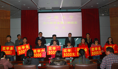 11月13日下午,河南大学道兴奖学金第三期颁奖仪式在金明校区行政楼一楼151会议室举行。兴亚集团执行总裁舒远汉、副总裁张会元,我校党委副书记王凌及学生处、教育发展基金会等相关负责人出席颁奖仪式。仪式由学生处副处长杨江涛主持。