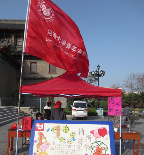 为传递爱心,回报社会,帮扶贫弱,充分利用资源的同时积极引导人们树立正确的社会主义价值观,做到既回收可利用资源又能够引导同学们加强社会责任感,弘扬社会爱心,自觉帮助社会弱势群体,回馈人文爱心,加强社会主义精神文明建设,为广大爱心同学创建一个和谐、有效、值得信赖的捐助平台,由校团委主办,校青协承办的捐衣捐物志愿活动在我校明伦校区举行。志愿者们收集了来自校内学生及周边社区的爱心人士捐赠的爱心书本、衣物等。多天的收集后,捐赠物品被整理分类,本地区内被捐赠至开封市SOS儿童村、开封市仁和小学和开封市民政局;本地区外被捐赠至宁夏回族自治区固原市西吉县红耀中学及青海省黄南藏族自治州同仁县曲库乎乡瓜什则村。