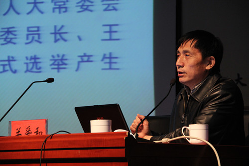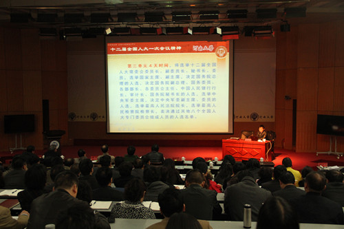 全国人大代表、校党委书记关爱和介绍了十二届全国人大一次会议召开的盛况,并畅谈了自己参会情况和履职体会。他传达了政府工作报告、全国人大常委会工作报告的主要精神,介绍了李克强同志参加河南代表团审议时的讲话精神、赵乐际同志与河南团代表一起审议政府工作报告的有关情况。他详细解读了国务院机构改革方案的核心内容和习近平同志在会议闭幕式上的讲话内涵,并介绍了李克强同志答记者问的有关情况。他还通报了代表们的议案和建议情况,介绍了本次会议在代表结构、领导班子、会议风气等方面的新变化。他说,作为基层单位,我们要认真贯彻十八大精神和“两会”精神,以创建高水平大学为目标,抓住机遇,把学校各项工作做得更好。